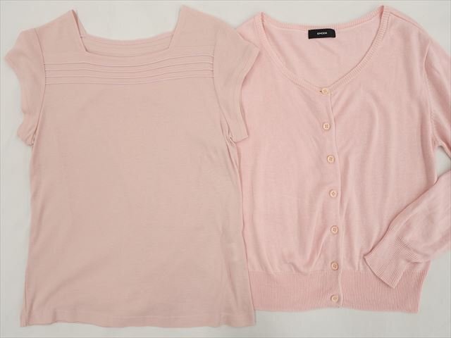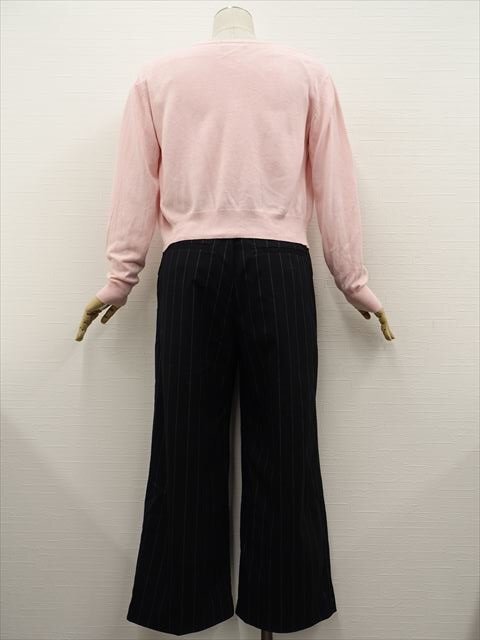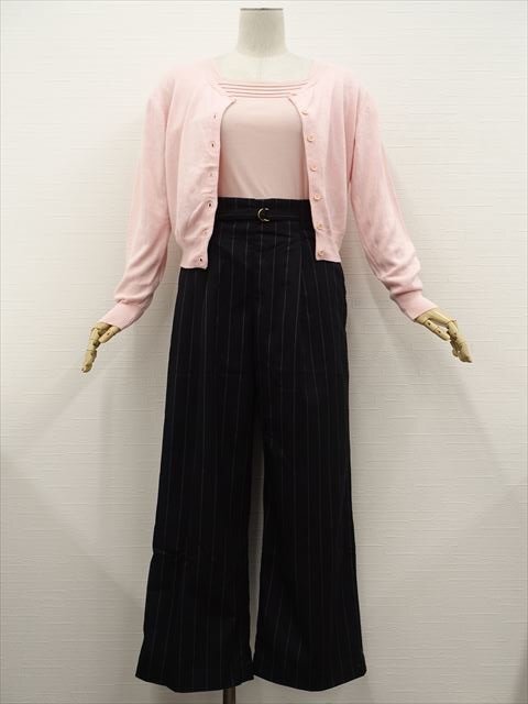 長袖ニットカーディガン+半袖カットソー+ワイドパンツ コーディネート上下3点セット M相当 ピンク/ネイビー地 ホワイト ストライプ柄 オフィス・シンプル・きれいめ系 20代・30代・40代・50代
