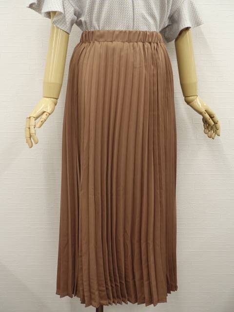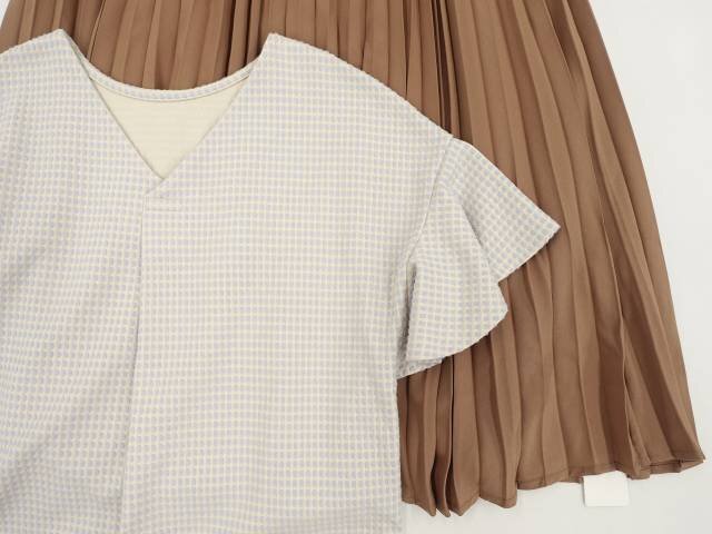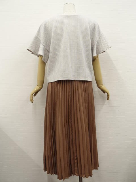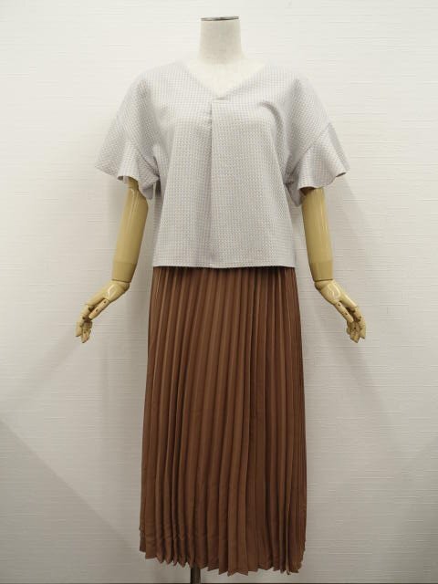 洗える半袖カットソー+ロング丈プリーツスカート コーディネート上下2点セット M相当 ライトブルー ベージュ 総柄/ブラウン きれいめ・フェミニン系 30代