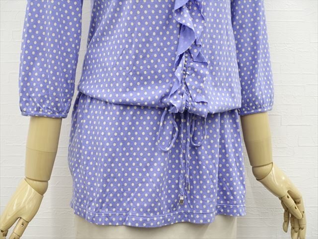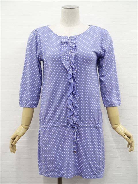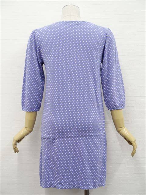 洗える ひざ丈 パフスリーブ 七分袖 ラウンドネック ワンピース M パープル系地 イエロー系 ドット柄 【メール便可】
