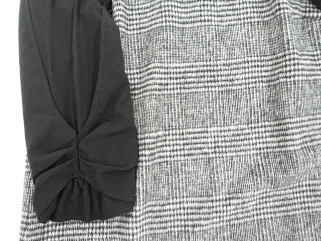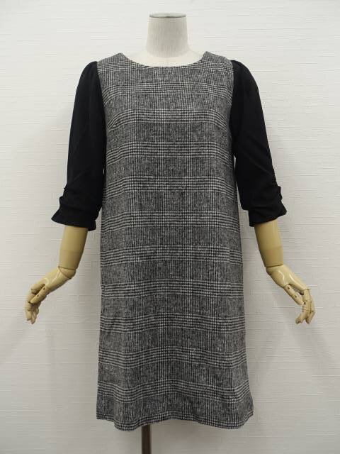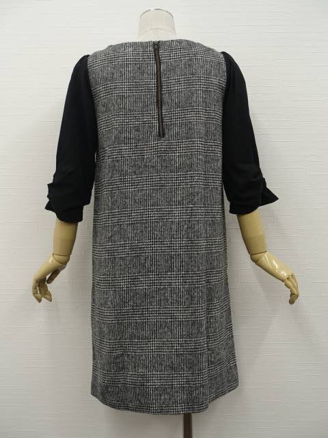 ひざ丈 デザインスリーブ 七分袖 ラウンドネック ワンピース S ブラック×グレー×ホワイト グレンチェック柄/ブラック
