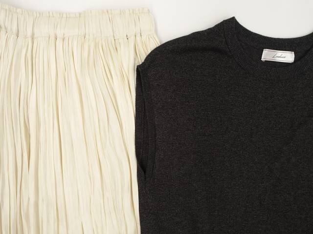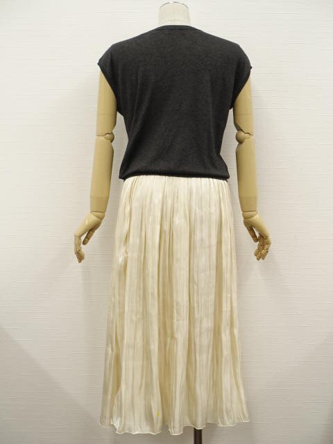洗えるノースリーブニットカットソー+ロング丈プリーツスカート コーディネート上下2点セット M相当 ダークグレー シルバーラメ入り/オフホワイト シンプル・カジュアル系 20代・30代・40代~