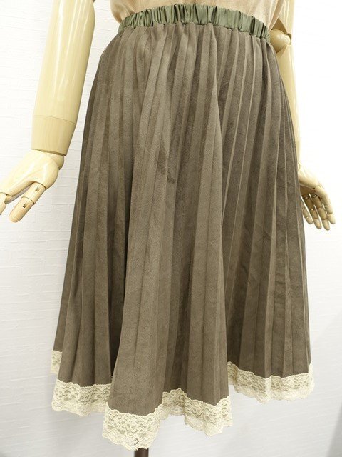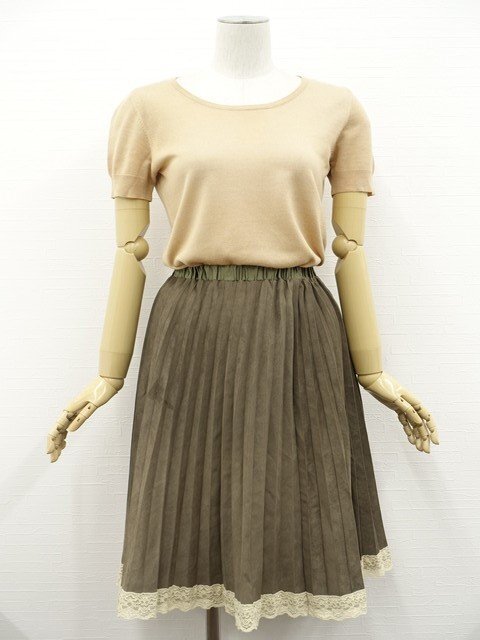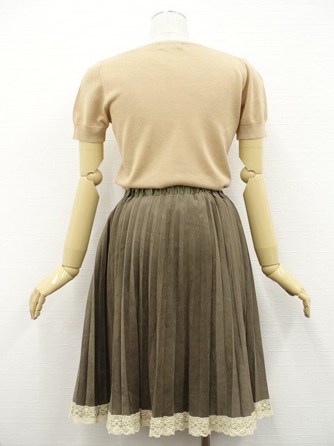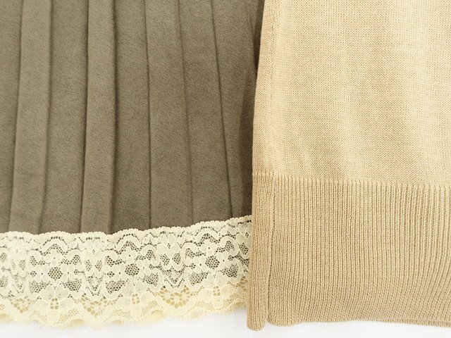 半袖ニットセーター+ひざ丈プリーツスカート コーディネート上下2点セット M相当 ブラウン/オリーブ×ブラウン×アイボリー 花柄 フェミニン 20代