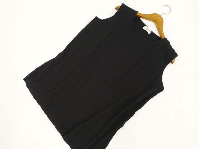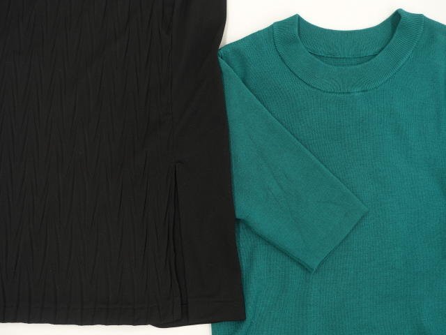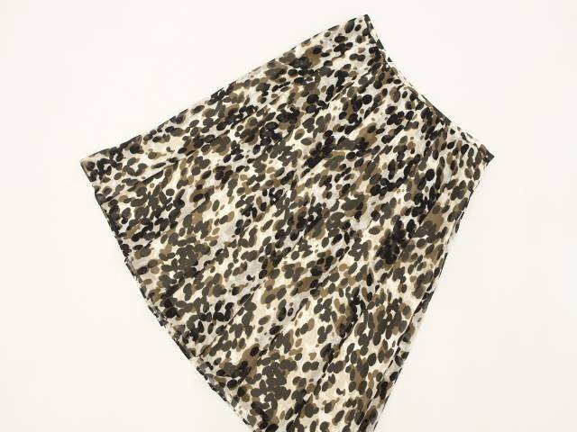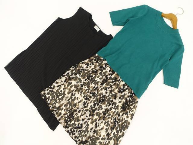 洗えるノースリーブカットソー+五分袖ニットカットソー+ひざ丈シフォンタックフレアスカート コーディネート上下3点セット M相当 ブラック/グリーン/オフホワイト地 ブラック×ブラウン 総柄 クール・きれいめ系 20代・30代・40代