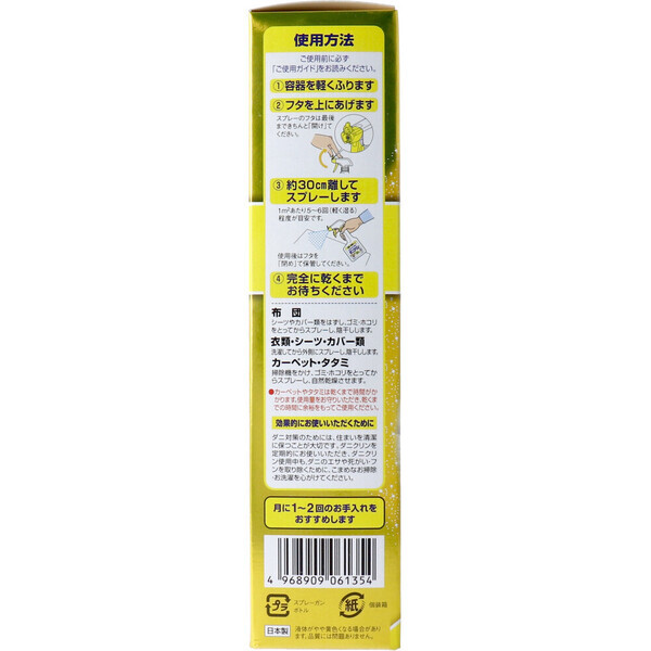 | スプレーするだけで防ダニ加工! 布団、枕、カーペット、ソファ、ぬいぐるみなどに! ・布団やタタミ、カーペットやソファーなどにシュッとスプレーするだけ。 ダニの嫌がる成分がダニをよせつけません。 ・安全性にも配慮し、寝具に使っても肌への刺激が少なく、スプレーしたところが口にふれても問題ありません。 ・シーツなどお洗濯するものは、お洗濯で2~3回程度、タタミやカーペットなら約1ヶ月効果が持続します。 ・スプレー後のべたつき感をおさえサラッと仕上げ。 個装サイズ:90X205X48mm 個装重量:約362g 内容量:250mL 製造国:日本 【発売元:UYEKI】 【有効成分】 脂肪族系カルボン酸エステル、サトウキビ抽出エキス、イソプロピルメチルフェノール(除菌剤) 【使用方法】 ・容器を軽くふり、ふたを上にあげ、約30cm離してスプレーします。 ・布団:シーツやカバー類をはずし、ゴミ、ホコリをとってからスプレーし、陰干しします。 ・カーペット・タタミ:掃除機をかけ、ゴミ、ホコリをとってからスプレーし、自然乾燥させます ※カーペットやタタミは乾くまで時間がかかります 使用量をお守りいただき、乾くまでの時間に余裕をもってご使用ください。 【使用上の注意】 ・用途以外に使用しない。 ・用途以外のものに本剤がかかった場合は拭きとる。 ・肌に本剤がかかった場合は洗い流す。 ・肌への影響が心配な方や匂いに敏感な方は、ハンドタオルのようなものにスプレーして試してから使う。 ・肌に合わない場合や匂いが気になるときは使用を止める。 ・色落ちするもの(新しいタタミや布製のもの等)、縮みやすいもの(絹・レーヨン等)、洗えないものは、あらかじめ目立たない場所で試してから使用する。 ・スプレーするときは換気し、吸い込んだり、目に入らないように注意する。 ・シミになる場合があるため、同じ場所に大量にスプレーしない。 ・タタミやカーペットにスプレー後、本剤が足やスリッパに付着してフローリング等がベタつく場合があるため、乾いていない間は、歩いたり、ふんだりしないように注意する。 ・子供の手の届かない、直射日光を避けた場所に保管する。 ・凍結したり高温になる場所には保管しない。 注意事項 予告なく成分・パッケージが変更になることがございます 予めご了承ください。 *予告なく成分・パッケージが変更になることがございます。予めご了承ください *ダンボールを使用して発送する場合には、入数以下の個数の場合、 中古ダンボールを使用する場合があり、ご注文の商品とは異なるダンボールになる場合があります。 あらかじめ、ご了承ください。 |