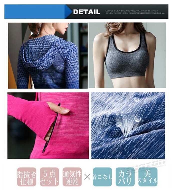 [商品説明]◎どんなコーディネートにも組み込めるシンプルなデザインがシーンを問わずに活躍します。◎初心者さんから上級者さんまで幅広く使用できるトレーニングウェア5点セット!!◎日常のトレーニングもおしゃれに楽しく。◎ウォーキングからランニングはもちろんヨガ、ジムでのトレーニング、エクササイズに最適。◎日頃の感謝を込めて、プレゼントにも最適です。◎春夏秋冬とオールシーズン、おしゃれに楽しみましょう。<仕様>●セット内容:スポーツパーカー、スポーツブラ、Tシャツ、ショートパンツ、タイツ付きパンツ●品質:ポリエステル90% スパンデックス10%