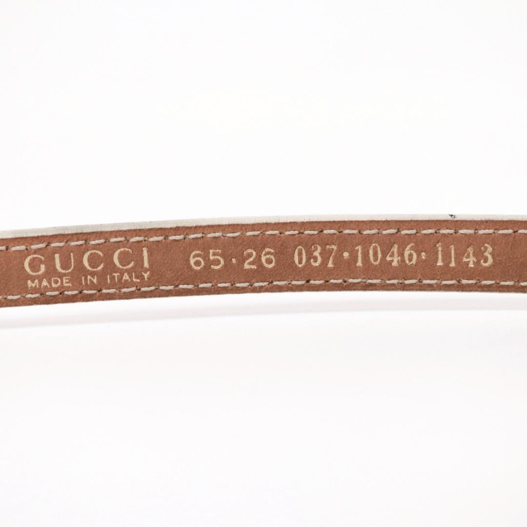 This GUCCI slim leather belt features a refined hook-style gold buckle and an elegant 1cm strap. Made in Italy, it carries the authentic GUCCI stamp (65-26 037・1046・1143). Although labeled “65,” it fits approximately 6580cm due to its adjustable hook design. A graceful accessory that enhances dresses, coats, and daily outfits with subtle luxury.