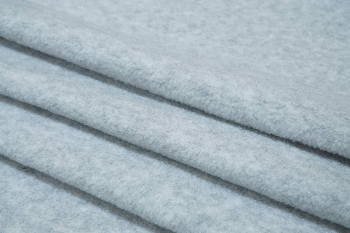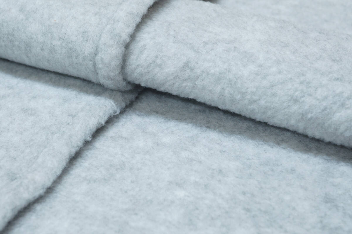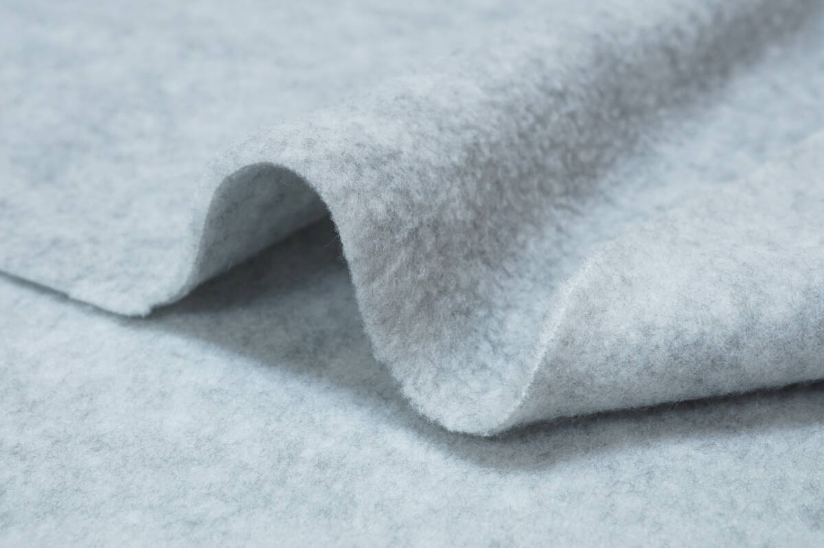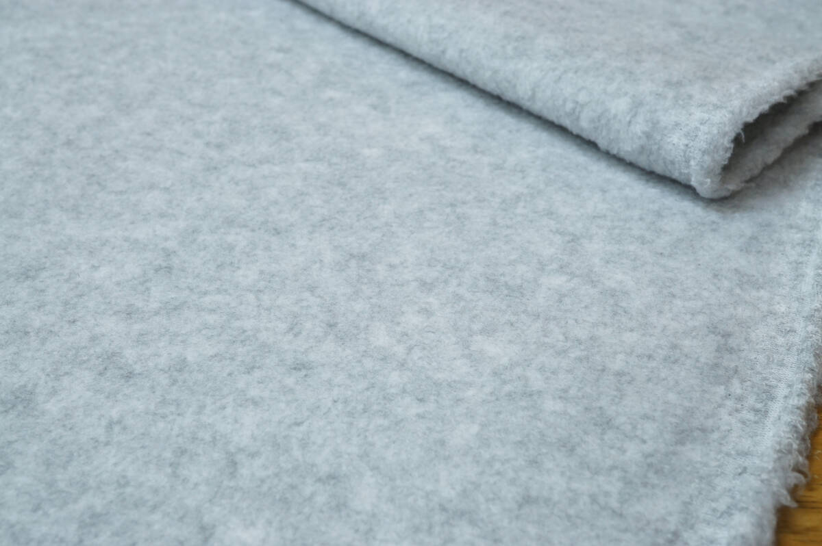 ポリエステル系、微厚、ソフトな風合い、あたたみのある起毛感、巾方向に伸縮性あり、色調:杢ライトグレーでございます。