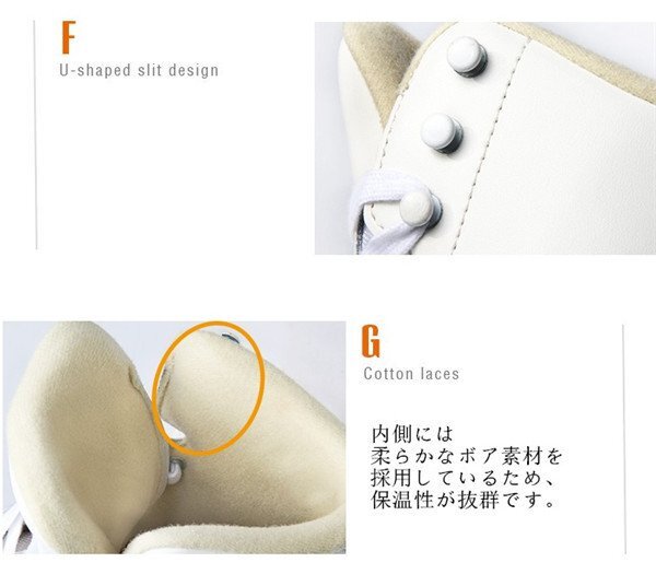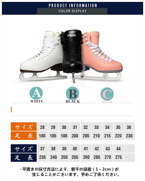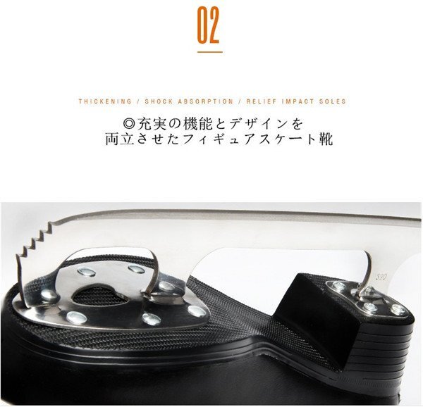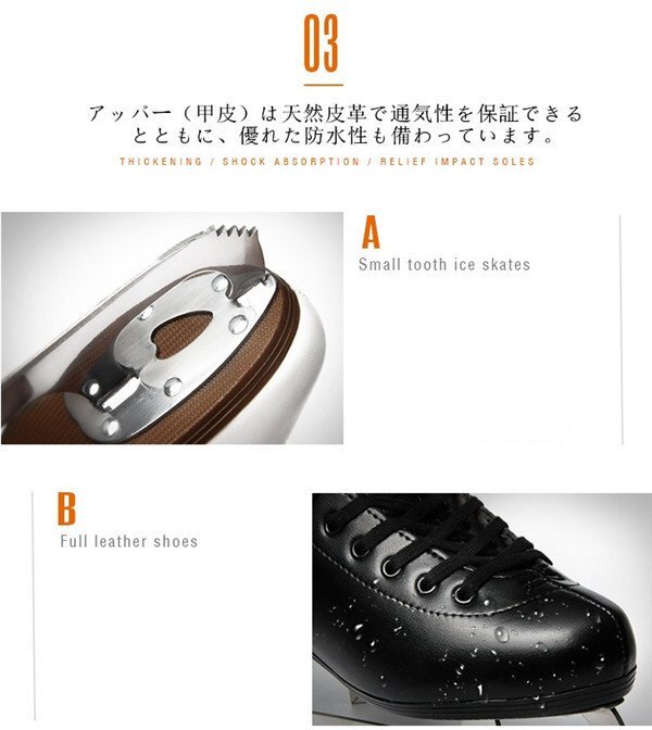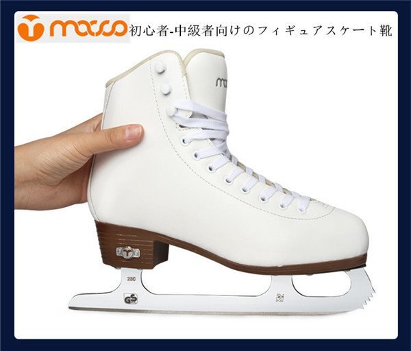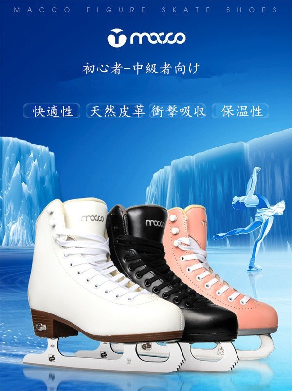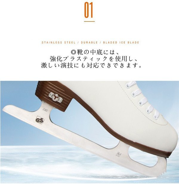 【商品特徴】[保温性]:内側には柔らかなボア素材を採用しているため、保温性が抜群です。[機能性]:◎充実の機能とデザインを両立させたフィギュアスケート靴      ◎抜群のフィット感はそのままに、足首のホールド性が格段にアップ。      ◎ハードな造りで、履き口にあしらったスポンジでソフトな足あたりを実現しました      ◎靴の中底には、強化プラスティックを使用し、激しい演技にも対応できる、[撥水加工]:アッパー(甲皮)は天然皮革で       通気性を保証できるとともに、良い防水性も備わっています。[御使用対象]:初心者-中級者向けのフィギュアスケート靴※サイズについて※普段履いているスニーカーやパンプスで一番大きいサイズをお勧めしております。大き目のサイズをご希望のお客様には、0.5cm,1cm上のサイズをご選択いただき、靴下の履き方(厚手の靴下,2枚履き)や中敷きのご利用等で調節される事をお勧めしております。※研磨について※ある程度研磨された状態でメーカーより出荷されますので、すぐに滑走が可能です。