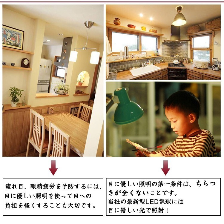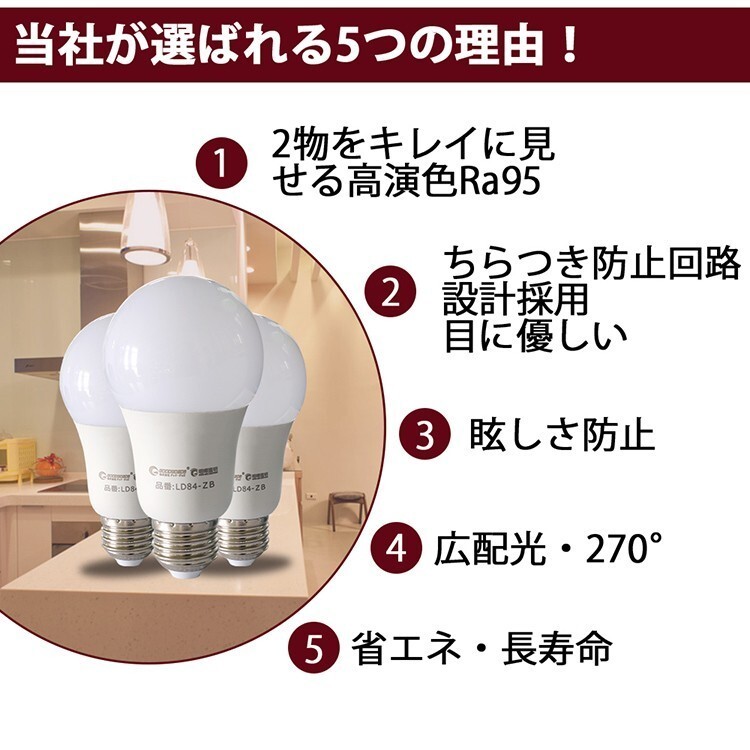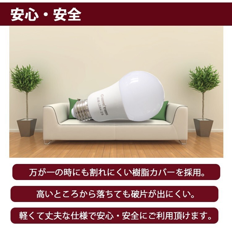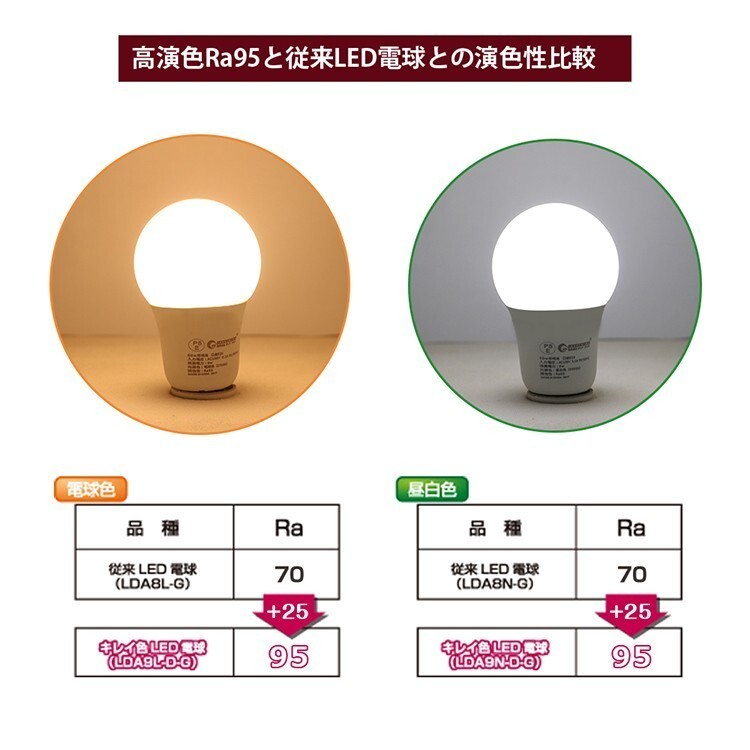 | ★オススメポイント★ 当社初の2年保証LED電球!高演色、広配光です。 物をキレイに見せる高演色Ra95 太陽光に非常に近い高演色性Ra95で、物の色を自然に再現。 ※演色性とは、照明で物体を照らすときに、自然光が当たったときの色をどの程度再現しているかを示す指標です。 Ra100は、自然光が当たったときと同様の色を再現していることを意味します。 一般家庭ではRa80以上の照明器具を使うことが推奨されています。 当社のLED電球は演色指数Ra95。自然光に近い雰囲気を演出します。 独自のちらつき防止回路設計採用!ちらつきなし! 当社の最新型LED電球には、目の疲れを軽減するちらつき防止加工を施しています!目への負担を軽くしました。 拡散カバーの採用により、LED電球特有のまぶしさ感を軽減し、優しい光を実現! 膨らんだ球形状の乳白色マルチ拡散グローブを採用することにより、LED電球特有のまぶしさを低減し、優しい光を実現しました。 広配光約270°! 高い拡散性と表面積の大きなカバーを採用し、指向性の高いLED光を背面方向まで自然な配光分布で広げています。配光角度270°、一般白熱電球・電球形蛍光ランプに近い光の広がりを実現! 発光色は、読書にも最適な【昼白色】と柔らかな光の【電球色】。 雰囲気などに合わせて2種類の色からお選びいただけます。 昼白色:すっきりとした爽やかな色味。電球色:温かみのある色味。 安心・安全 万が一の時にも割れにくい樹脂カバーを採用。高いところから落ちても破片が出にくい。軽くて丈夫な仕様で安心・安全にご利用頂けます。 省エネ・長寿命 従来の白熱電球に比べ、消費電力を約85%カットし、電気代を大幅に節約! また、LED電球の設計寿命は約40,000時間で、従来の白熱電球の約40倍です。交換の手間が省けます、取替が面倒な高所への設置もおすすめです。 様々な場所・用途でご使用いただけます。 (1)ご家庭用: リビング・ダイニング・キッチン・脱衣所・玄関・洗面所などの照明に最適です。 (2)店舗・施設用: 店舗・事業所・教室・ショッピングセンター・施設などで最も多く使用されています。 |