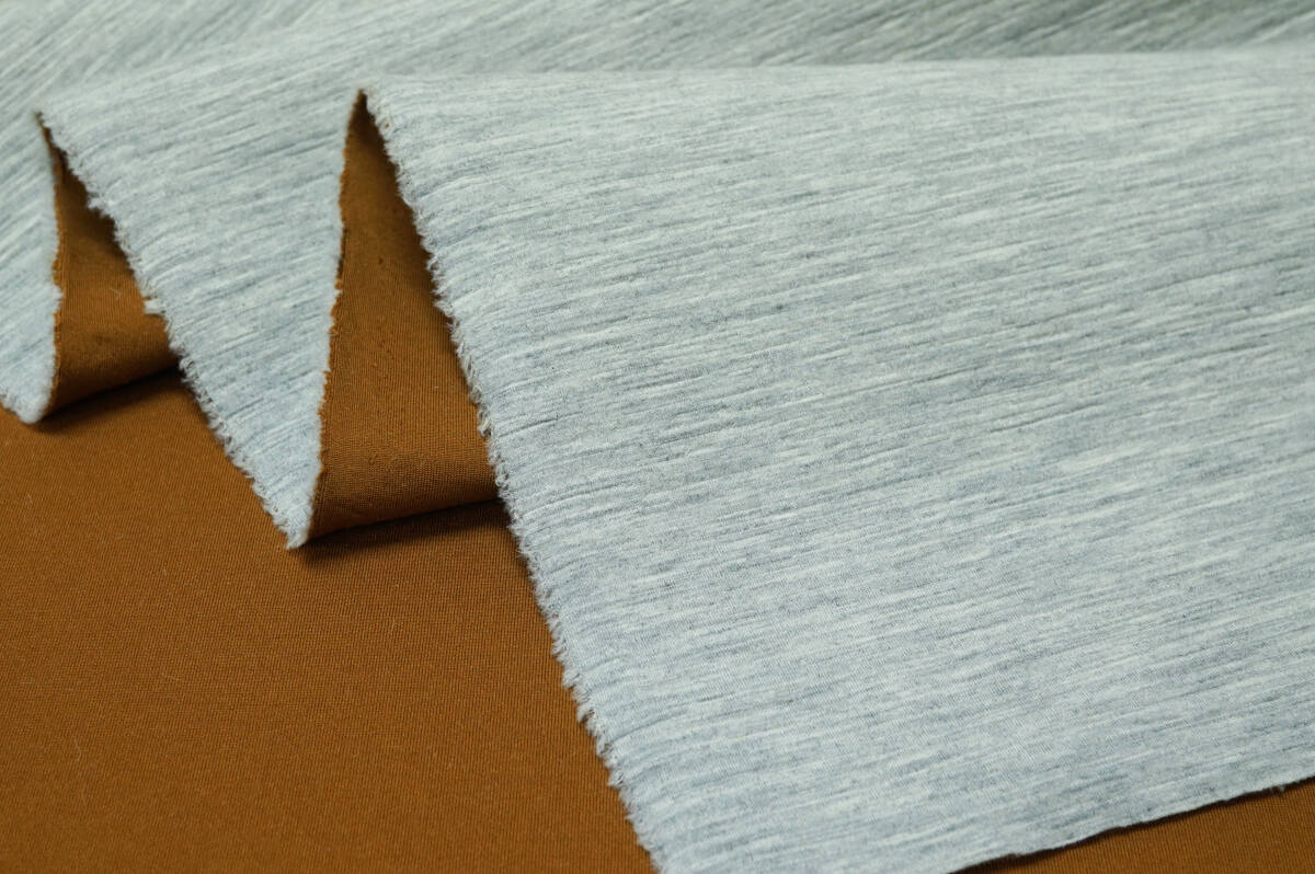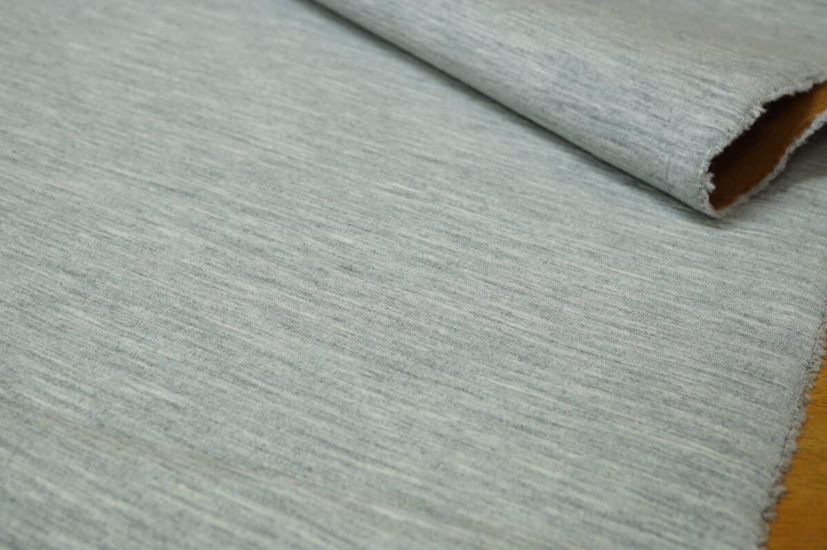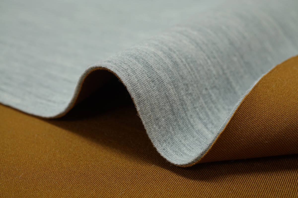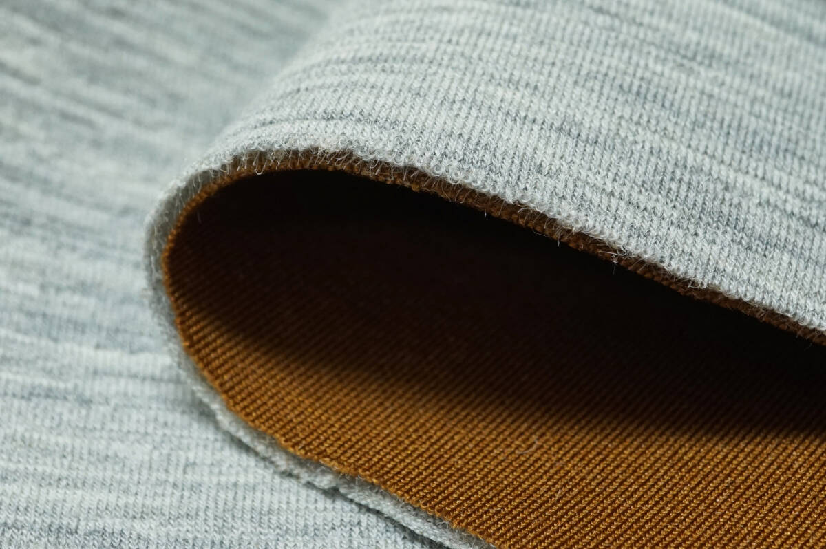 ウール・ポリエステル・ポリウレタン(混紡率不明)、やや厚地~微厚程度、2way伸縮タイプ、色調:杢調グレー(ウール)×キャメルブラウン(ポリエステル)系、二重構造の間に空気をため込むため保温性があります。