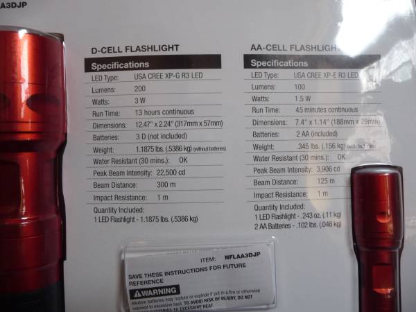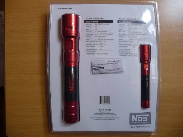 | ★商品説明★ | 限定値下げ! ナイトラス・オキサイド・システムで有名なアメリカのNOS社製 ハイパワーLEDフラッシュライト 映画『ワイルド・スピード』でも使用されている ナイトラス・オキサイド・システムで有名なNOS社製です NOSの代名詞ともいえるアルマイト塗装 LEDにはアメリカのCREE/クリー社製 XP-Gという最新の明る く節電に優れたLEDを用い、明るさは大(3D)200ルーメン、 小(2AA)100ルーメンです ボディには滑り止めのゴムが巻き付けられるため、グリップも 良くホールド感は抜群です 単一電池は付属しておりませんのでご注意下さい 【3D-CELL フラッシュライト (大)】 明るさ:200ルーメン/22500カンデラ/3ワット 照射範囲:300m 全長:約317mm 直径:約57mm 重量:約538.6g バッテリー:単1電池3本使用(※別売り) LED type:USA CREE XP-G R3 LED 点灯時間:13時間 画像は2個の撮影ですが右側大きい方です 大きさの比較や価格が安く買える様にバラ売りします 置いているだけでも絵になりますね パッケージを半分に切っての発送ですが点灯確認の為開封しています 最近オークションに参加される方の (質問欄なども) マナーがとても悪いので、残念です 評価欄見て下さい (ヤカラ・自分の理解力の無さ!) 身勝手な解釈・梱包仕方など 疑問な点は必ず質問から問い合わせ下さい 非常識の方は参加しないように、御願いします 携帯電話から参加される方説明文が読めない所も 有りますので、必ずパソコンで確認下さい 即納しますので3日間で取引出来る方のみ 入札参加御願いします すべての出品物と同梱可です ※その他多数出品中! |