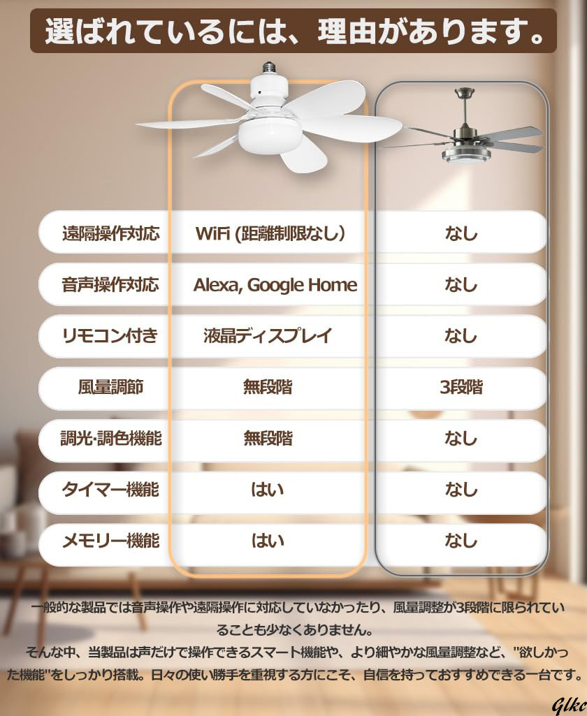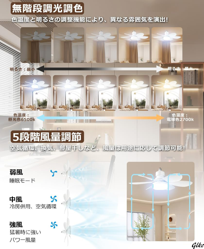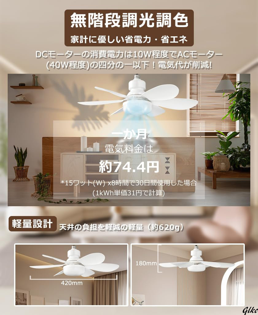 天井取り付けで部屋全体に明るい光と心地よい風を同時に届け、床置きの扇風機が不要になります。