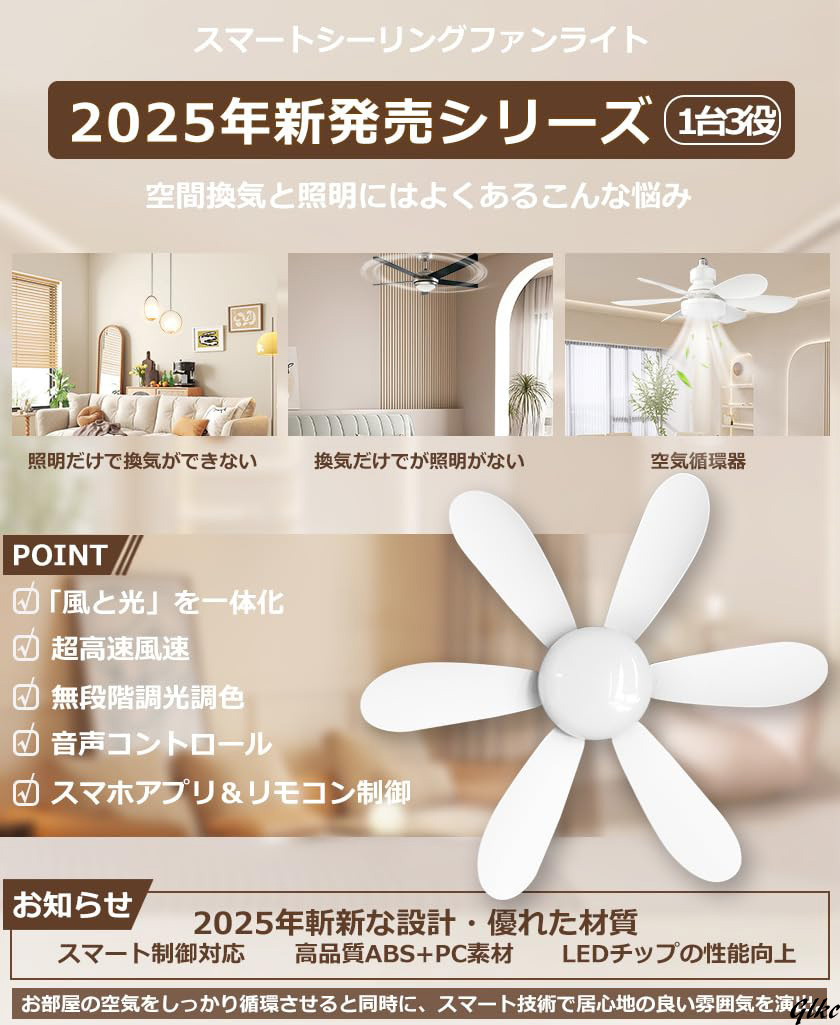 省エネ設計のLEDシーリングファンライトは、照明と扇風機の機能を1台に集約。