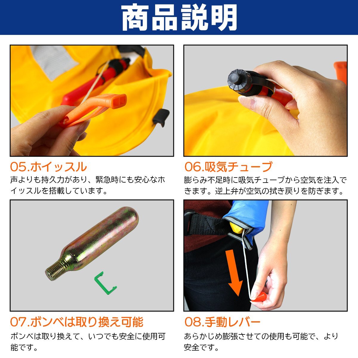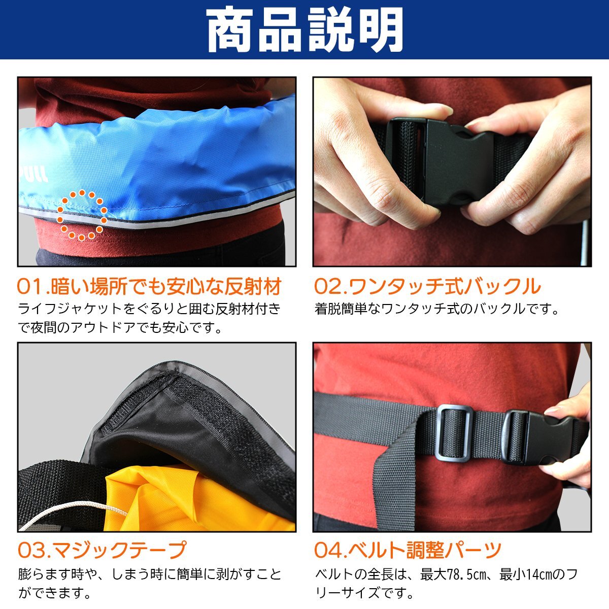 商 品 説 明■動きを妨げないウエストベルト腰巻きタイプのライフジャケット、手動膨張タイプです。