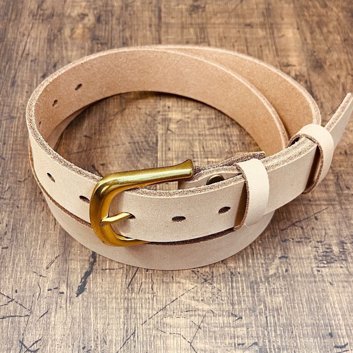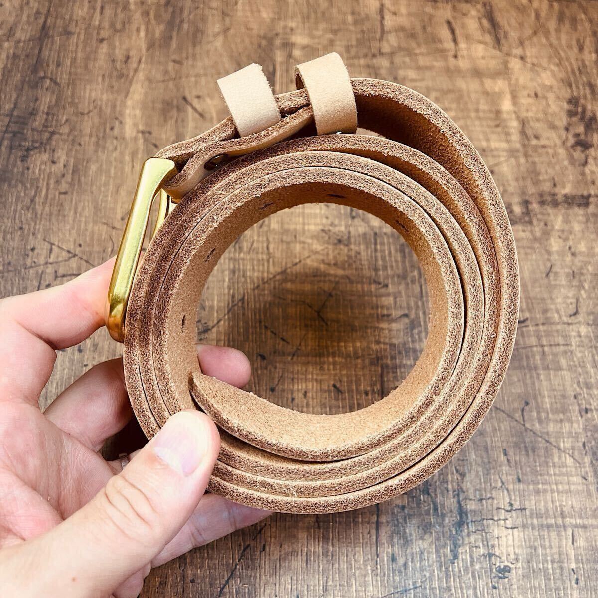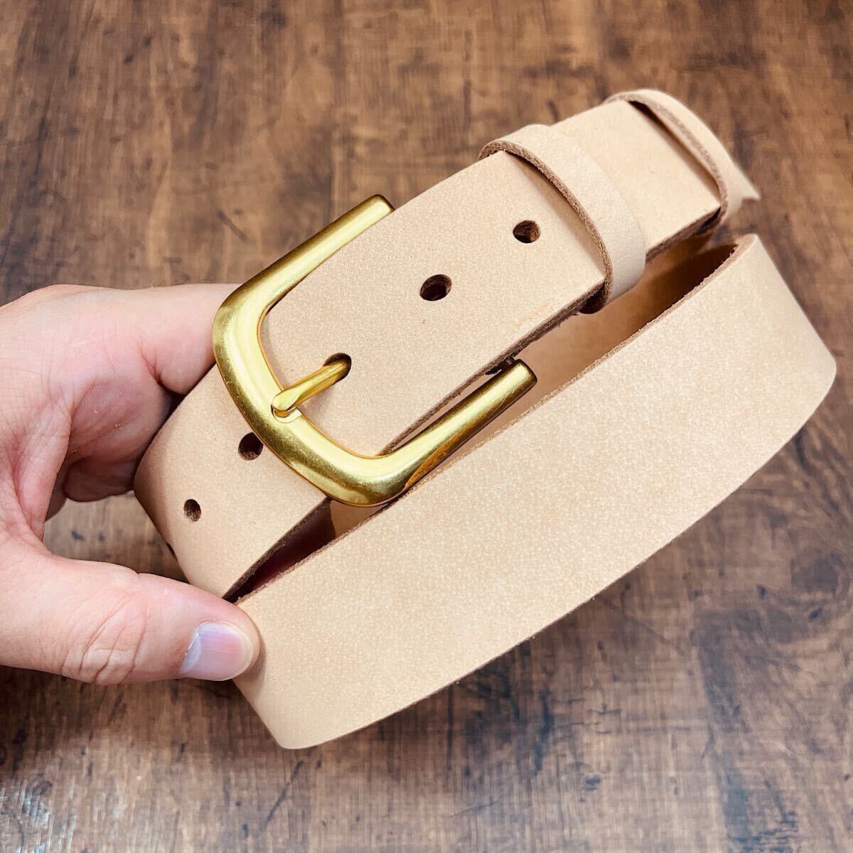 本革の醍醐味であるエイジングが存分に楽しめるナチュラルヌメ革を使用したレザーベルトです。使えば使うほどに味が出てきます。しっかりとした厚みで作られた重厚なゴールド色のバックルが高級感を与えます。