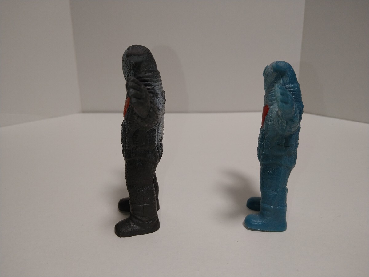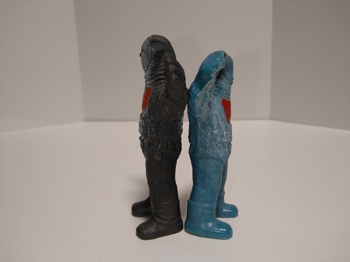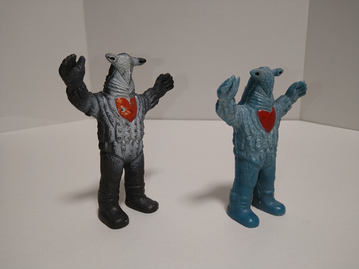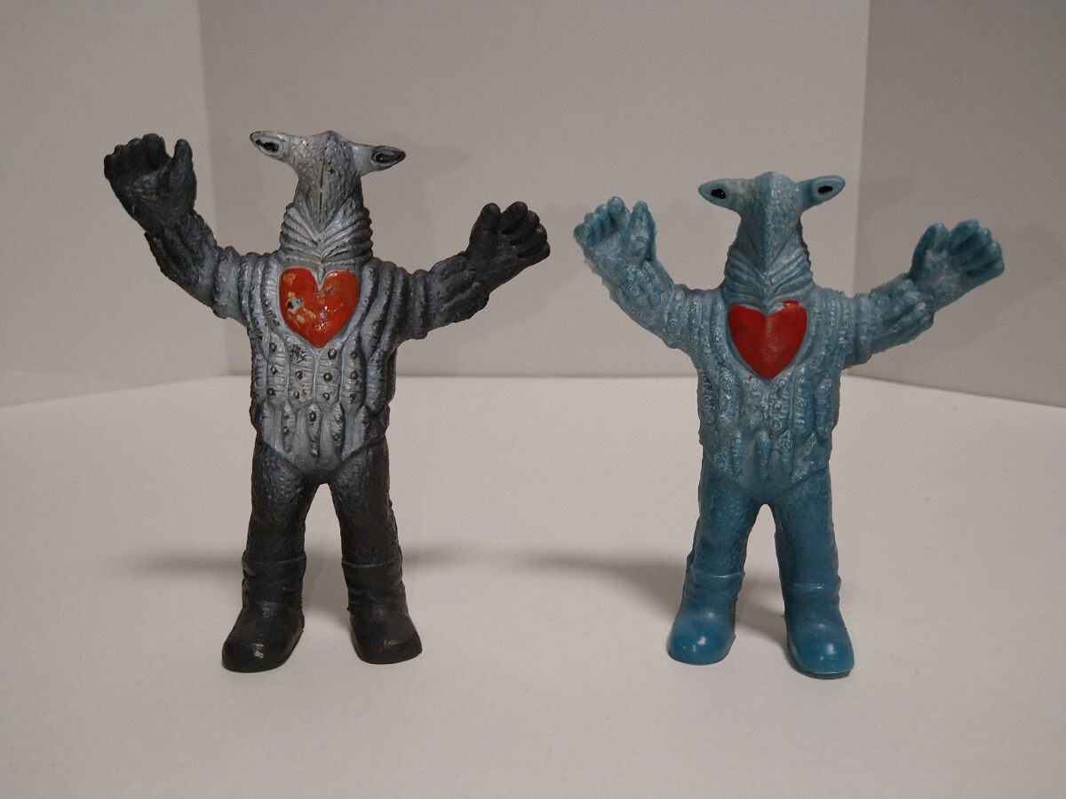 ポピーがキングザウルスシリーズを展開していた1979年(昭和54年)に発売されたペガッサ星人のエンビ製人形とそのパチ物の2体セットです。大きさはポピー製が約96ミリ、パチ物が約89ミリです。中古品でパッケージは無く、人形本体のみの出品です。