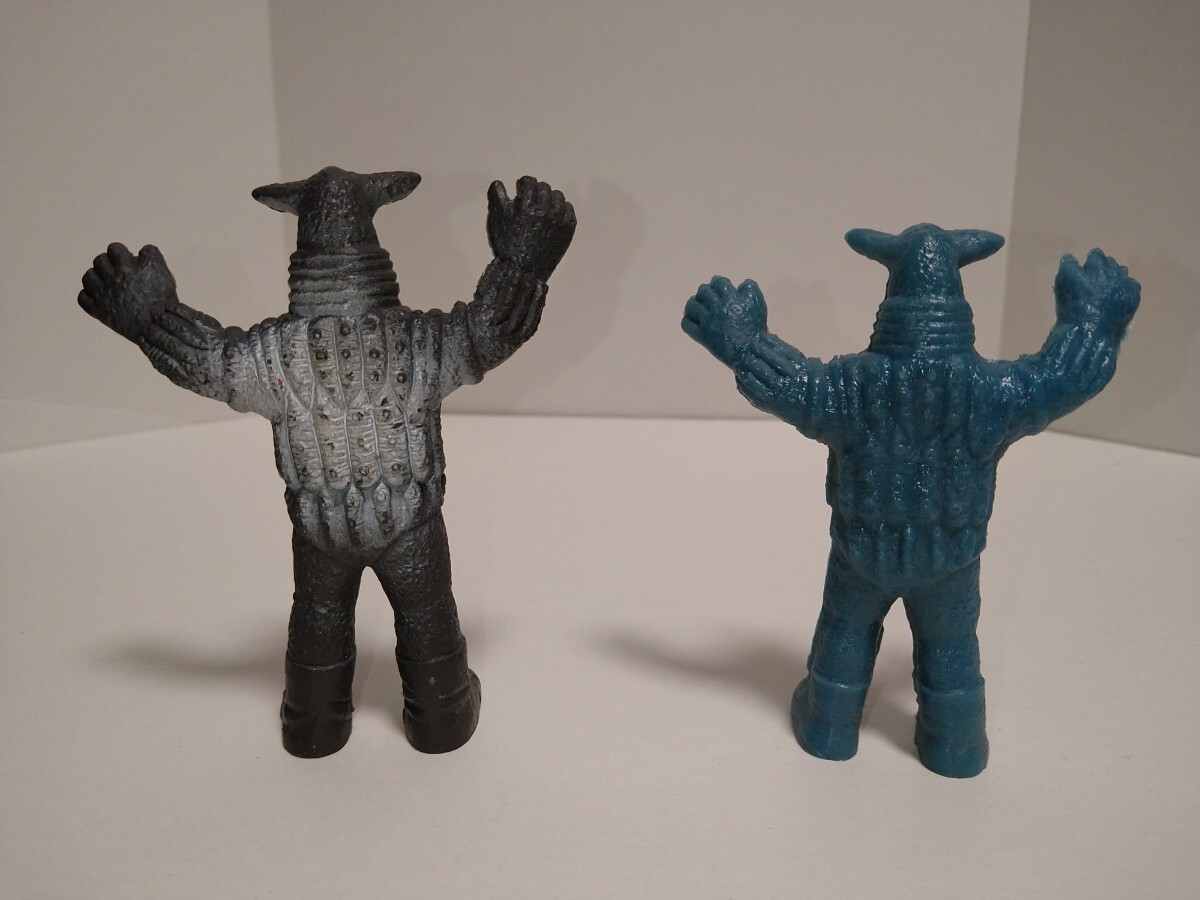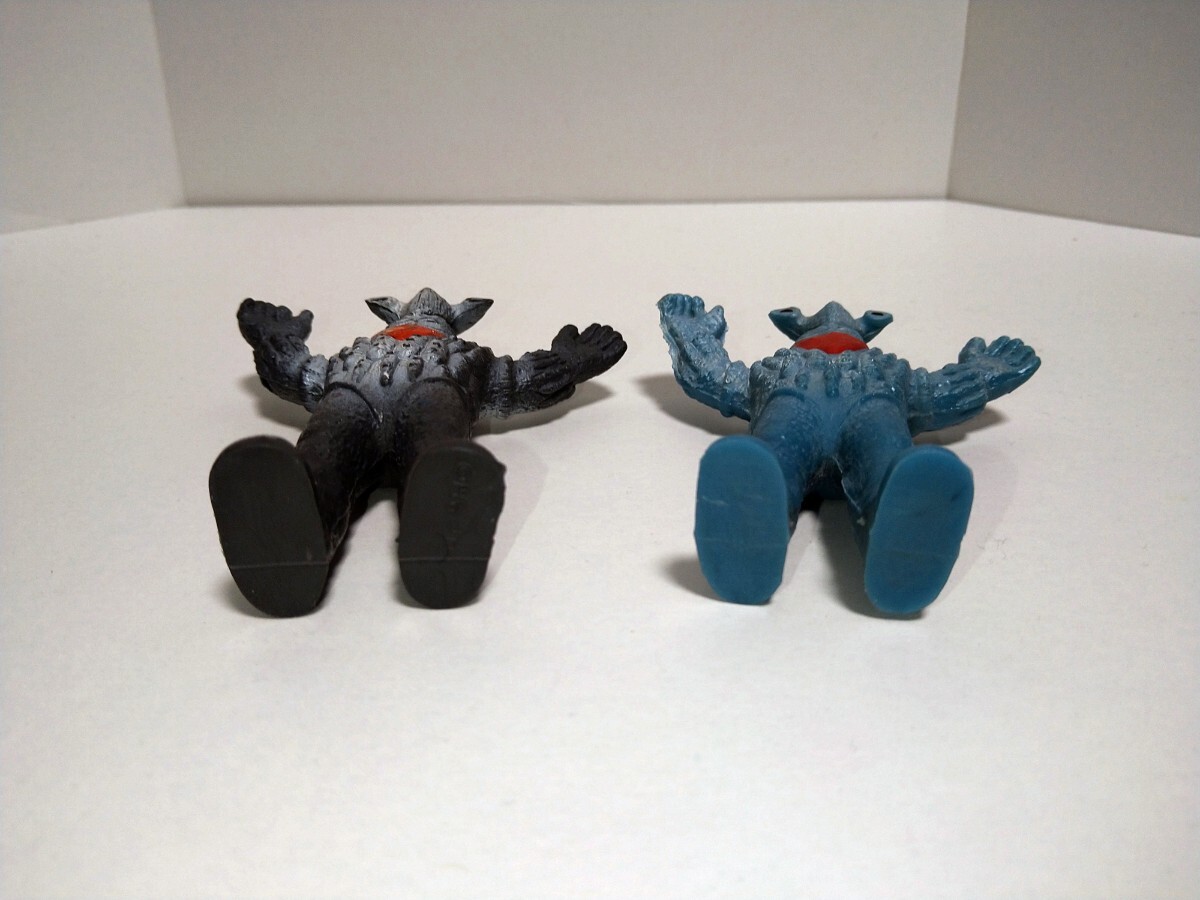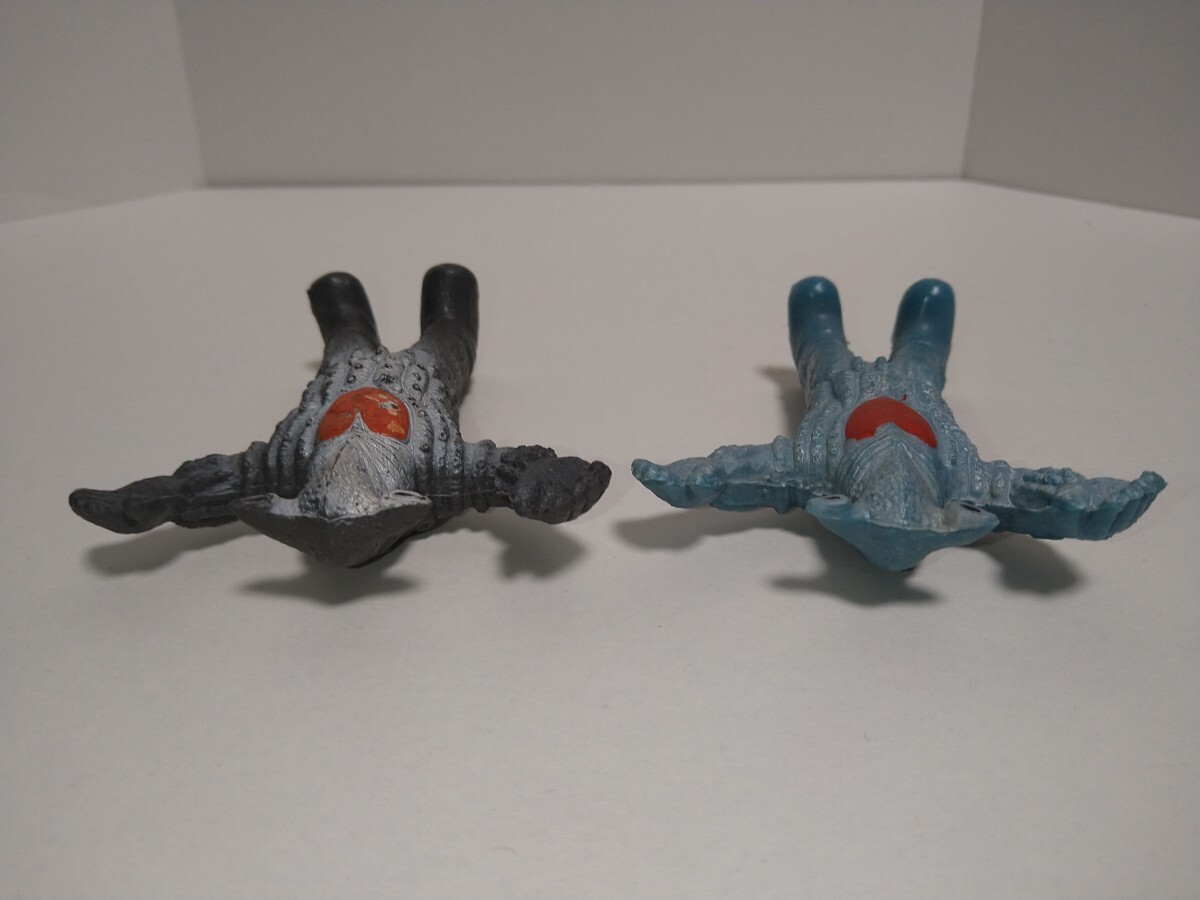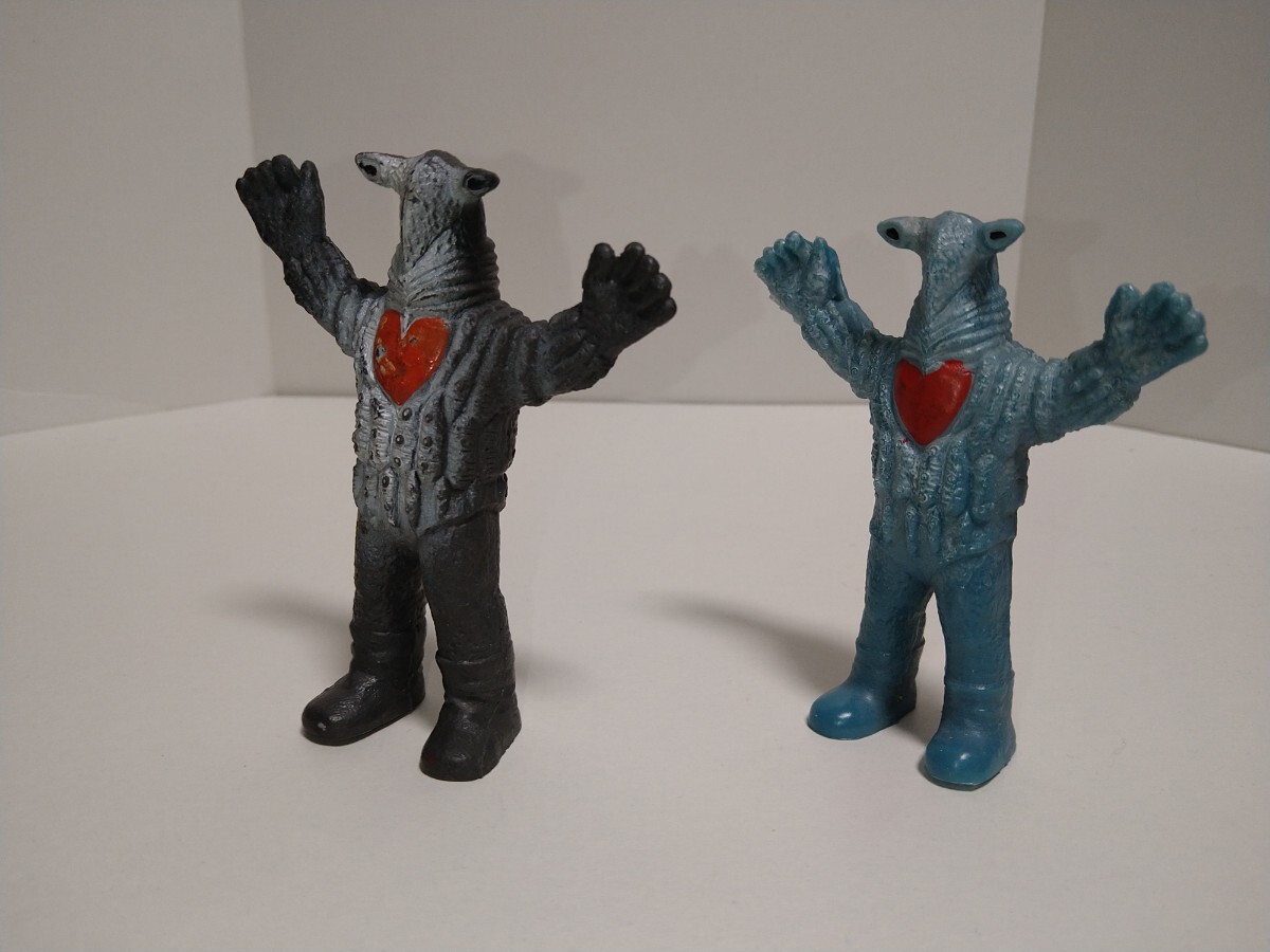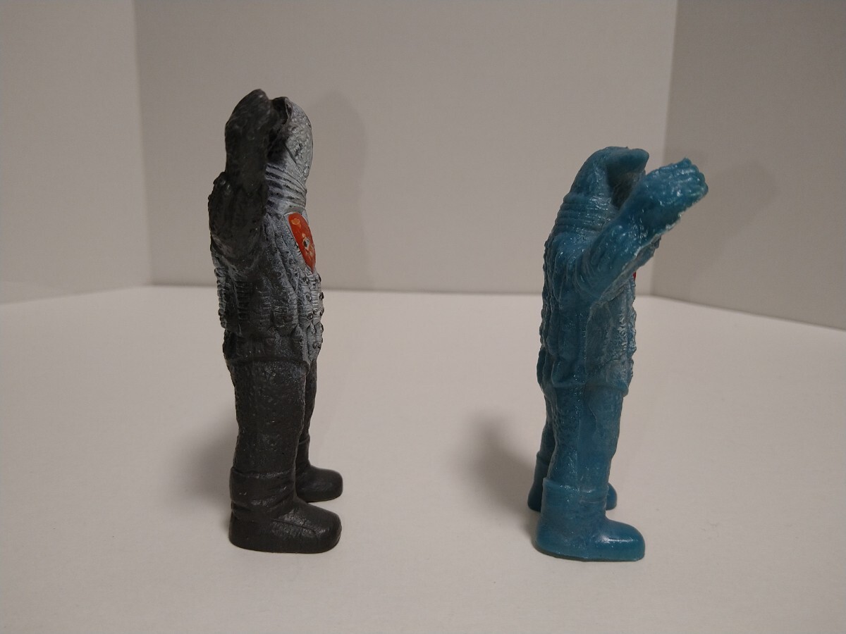 ポピーがキングザウルスシリーズを展開していた1979年(昭和54年)に発売されたペガッサ星人のエンビ製人形とそのパチ物の2体セットです。大きさはポピー製が約96ミリ、パチ物が約89ミリです。中古品でパッケージは無く、人形本体のみの出品です。