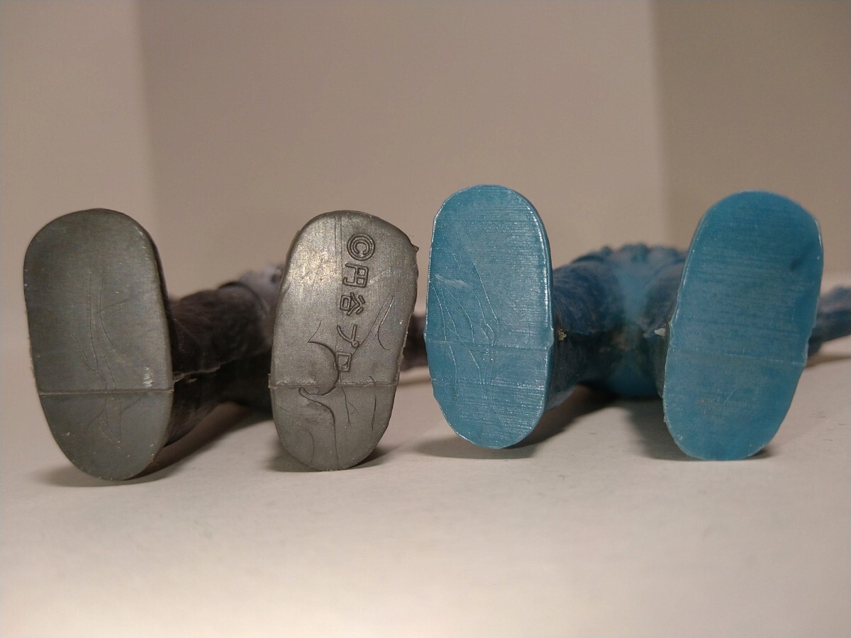 ポピー製の方は成型色がダークグレーで弾力があります。パチ物はブルーグレーで硬めのエンビです。彩色自体は大きな差がありません。どちらもエンビのムクで1パーツ成型です。可動部はありません。