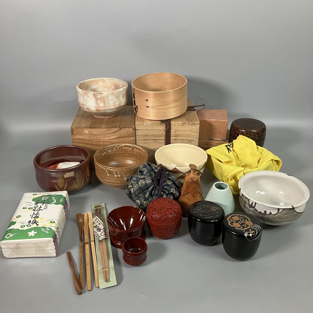 | L3-449【直接引取歓迎 栃木県矢板市】茶道具 茶碗 抹茶碗 棗 建水 香合 懐紙 茶杓 茶入れ 茶筅立て 等 まとめて 中古品 | ||