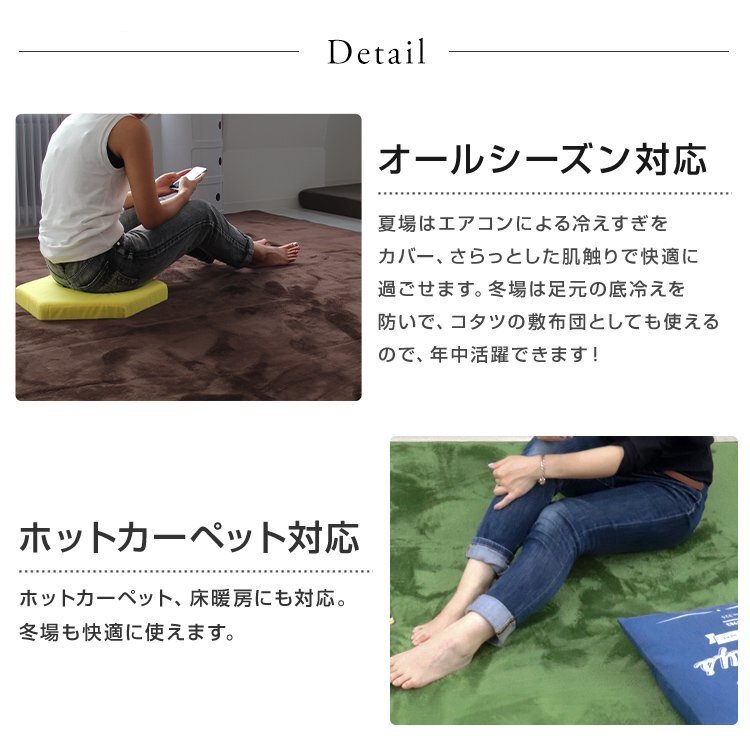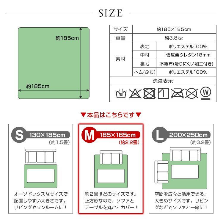 | 夏はサラッと、冬はあったか。 オールシーズン!快適に使えるラグマットです。 ソファーの前にテーブルを置いた際に使い勝手が良く、 いろいろなタイプのお部屋に合わせやすいサイズです♪ 裏面にはゴム製の滑り止め加工が施してあり、フローリングに敷いても滑りにくく、 小さなお子様やペットがいらっしゃるご家庭でも安心です! 毛足が短く、表面がサラサラなので簡単にお掃除がでるので いつでも清潔にご使用いただけます。 極厚のウレタン中材のクッション性により、階下への生活音を軽減。 床暖房やホットカーペットに対応しているので、 なめらかな肌触りを1年中楽しむことができます!! 【商品仕様】 カラー:モスグリーン サイズ(約):185×185cm 重量(約):3.8kg 素材: ・表地:ポリエステル100% ・中材:低反発ウレタン18mm ・裏面:不織布(滑り止め付) ・ヘム(ふち):ポリエステル100% |