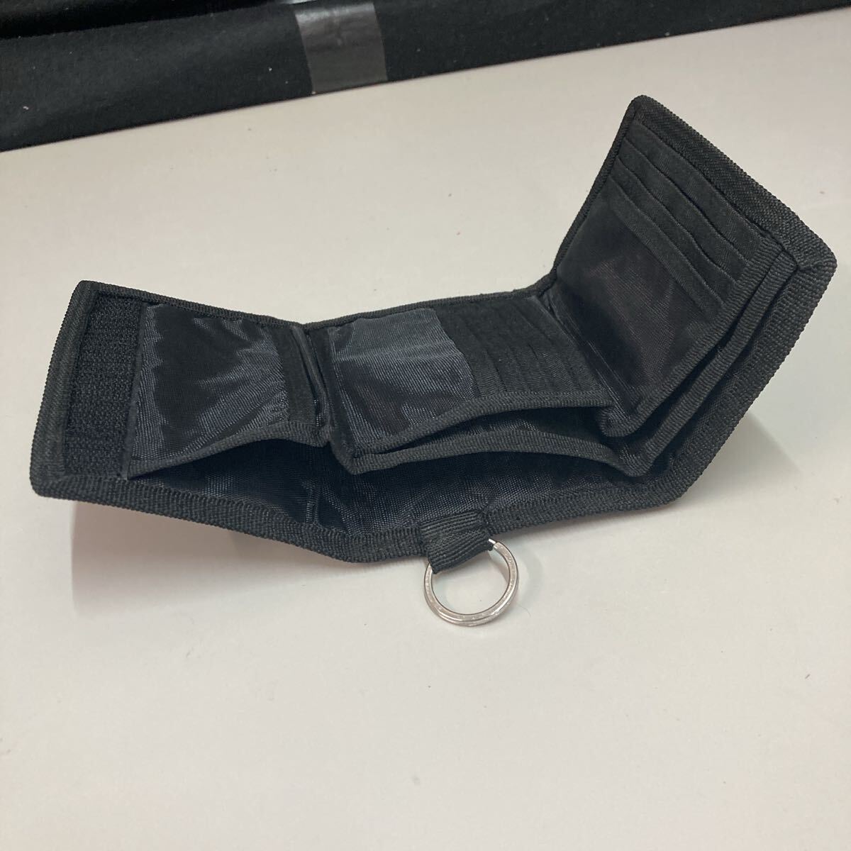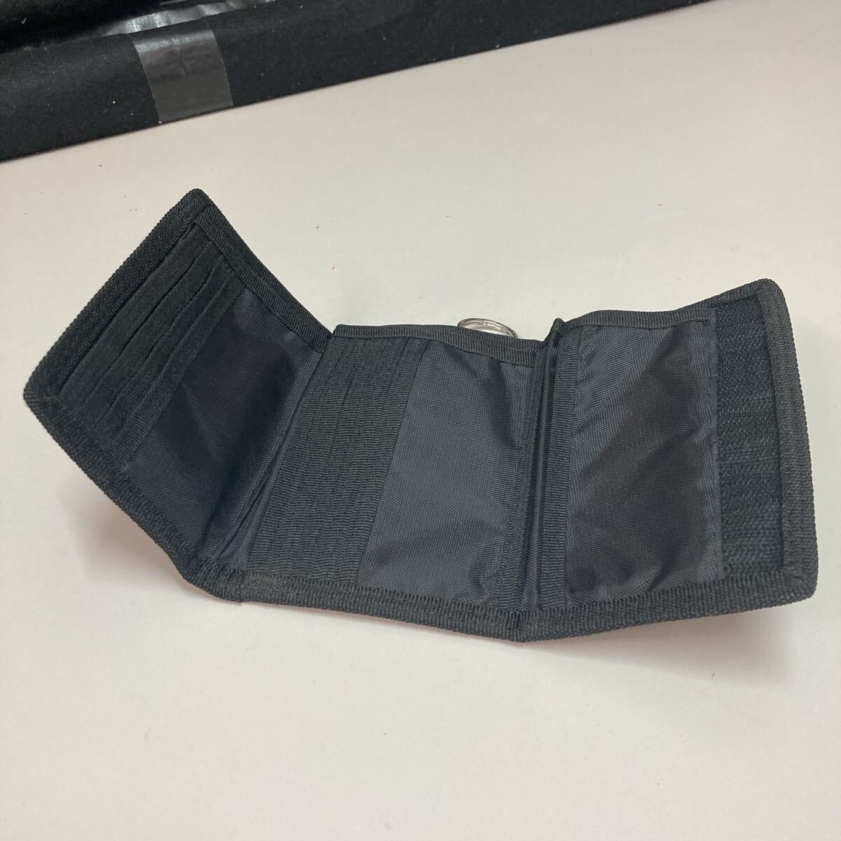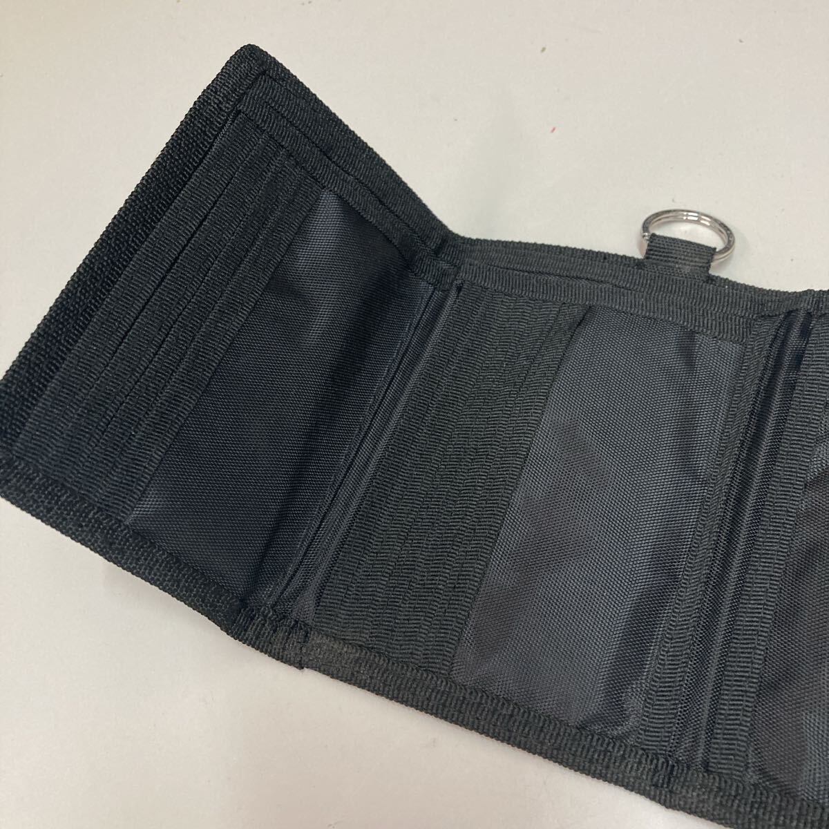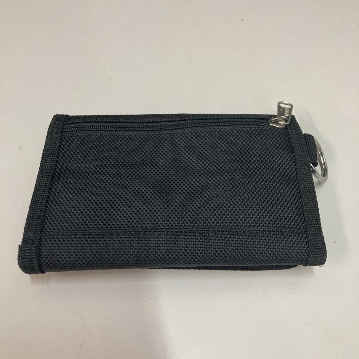 ナイロン製のブラック財布、ジッパー付きでポケットが複数あり、収納力抜群。