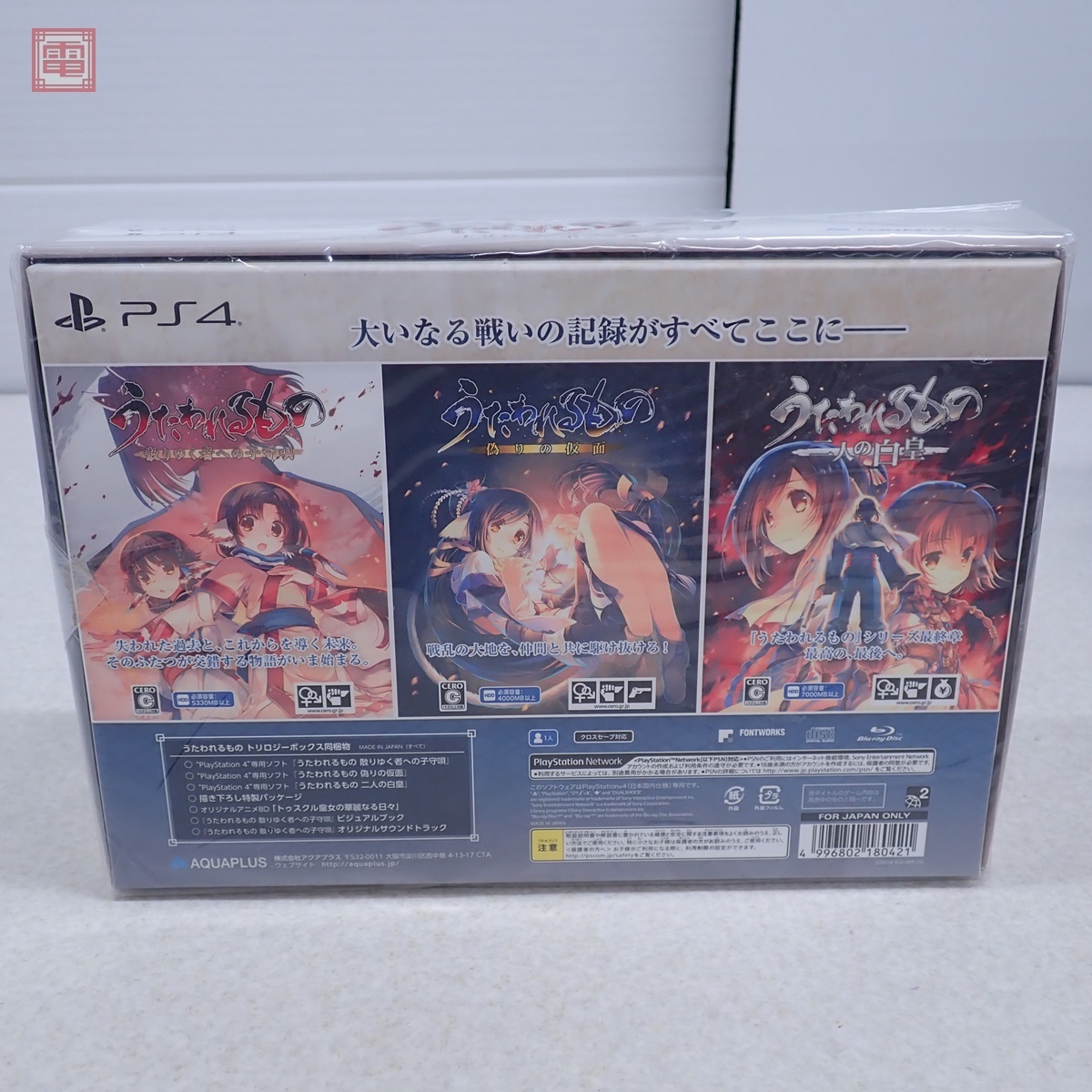 未開封 PS4 プレステ4 うたわれるもの トリロジーボックス AQUAPLUS アクアプラス ■未開封と判断しましたので、未チェックのままお譲りします。万が一、開封済み品であった場合はご容赦ください。 ■こちらの商品は未開封のままでお譲りいたします。 ■未開封品は未開封である事に価値があるため開封後のクレームや返品に応じる事は出来ません。 ■外装にスレ、キズ、汚れがあります。 ■写真のものが全てです。付属物の有無や状態については写真からご判断ください。 ■付属物については細かいチェックはしておりませんので、万が一、欠品があったり余計な物が入っていたとしてもご了承ください。 ■商品到着後、当店の保証期間中は、商品及び箱や取説、付属品などを1つでも廃棄や破損をしないようにお願い致します。廃棄や破損をした場合、商品に問題があった場合でも対応や返金などの対処ができなくなります。 ■商品によりますが、発売されてから10年以上経過している中古品である事をご理解頂いた上でご入札をお願い致します。なお、新品や美品、また特記事項がある場合は別途明記します。 | |||