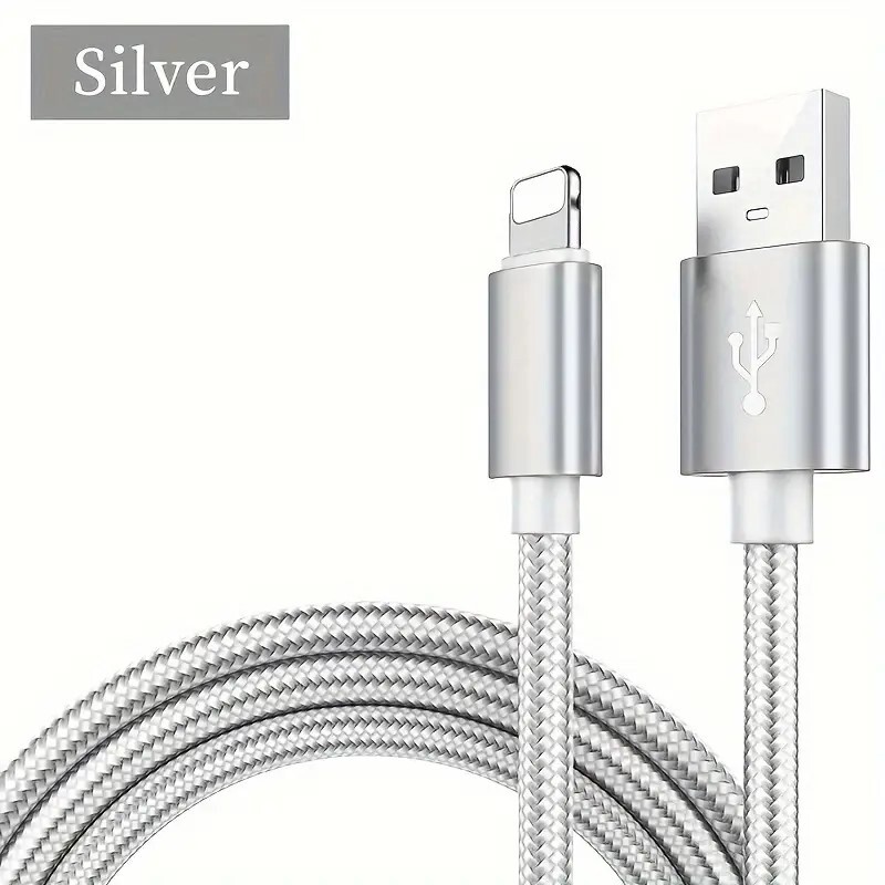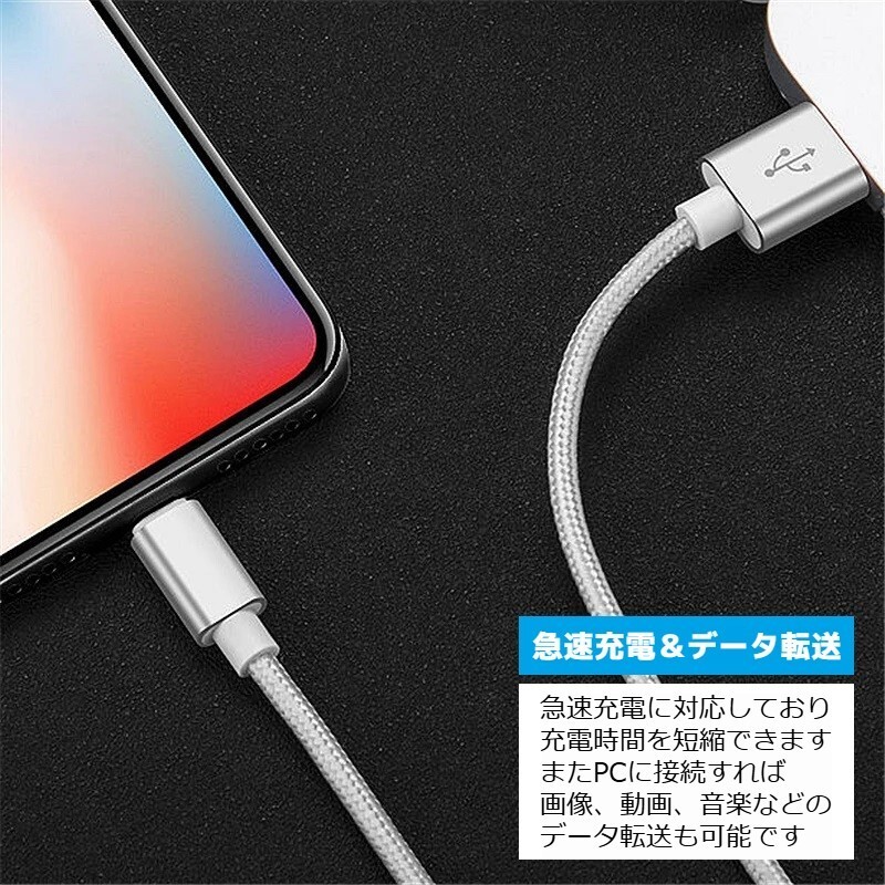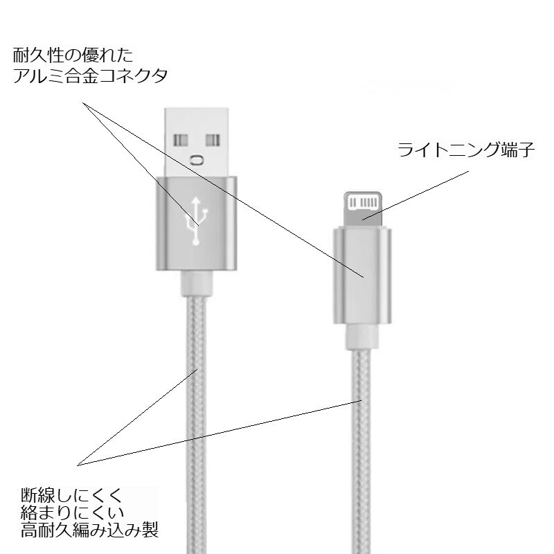 iPhone 急速充電 充電 データ データ通信 データ転送 ケーブル コード 1m 100cm スマホ スマートフォン ナイロン ナイロン製 メッシュ 強化ケーブル ライトニング 銀 銀色