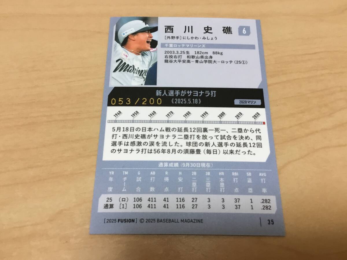 BBM2025☆fusion☆フュージョン☆西川史礁☆記録の殿堂☆200枚限定☆ヘアライン金紙版☆千葉ロッテマリーンズ☆ルーキーカード☆RC