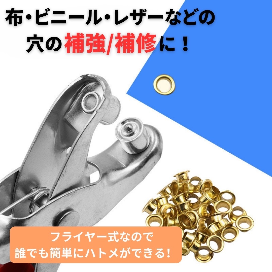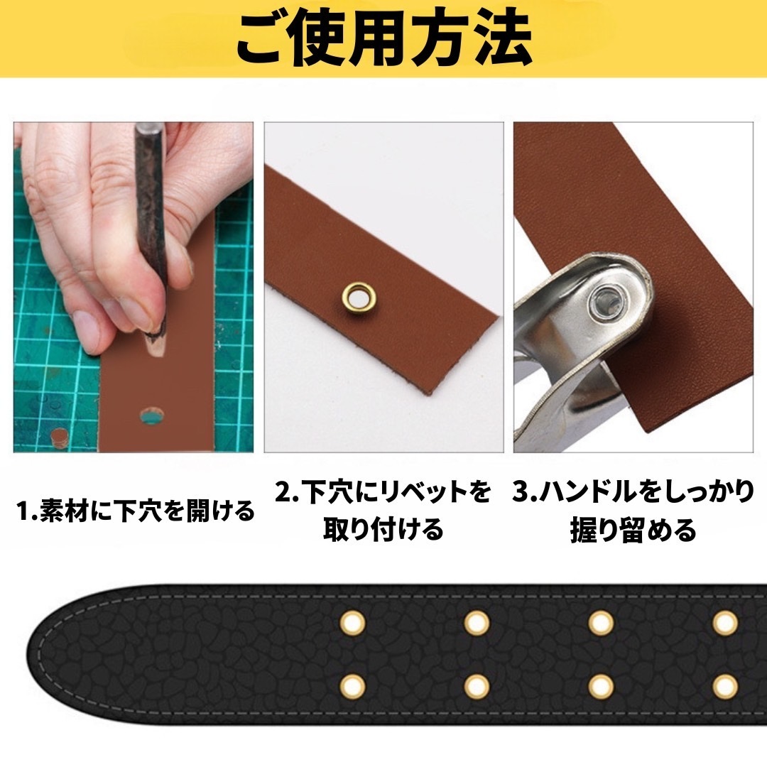 穴が広がりにくい仕様になっており、ハトメを設置することで製品の寿命を延ばすことができます。ハンドメイドやレザークラフト、ベルトの補修などに活用いただけます。