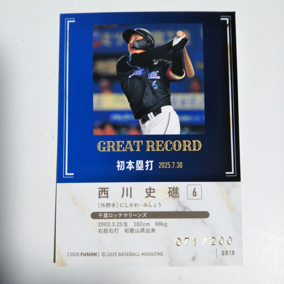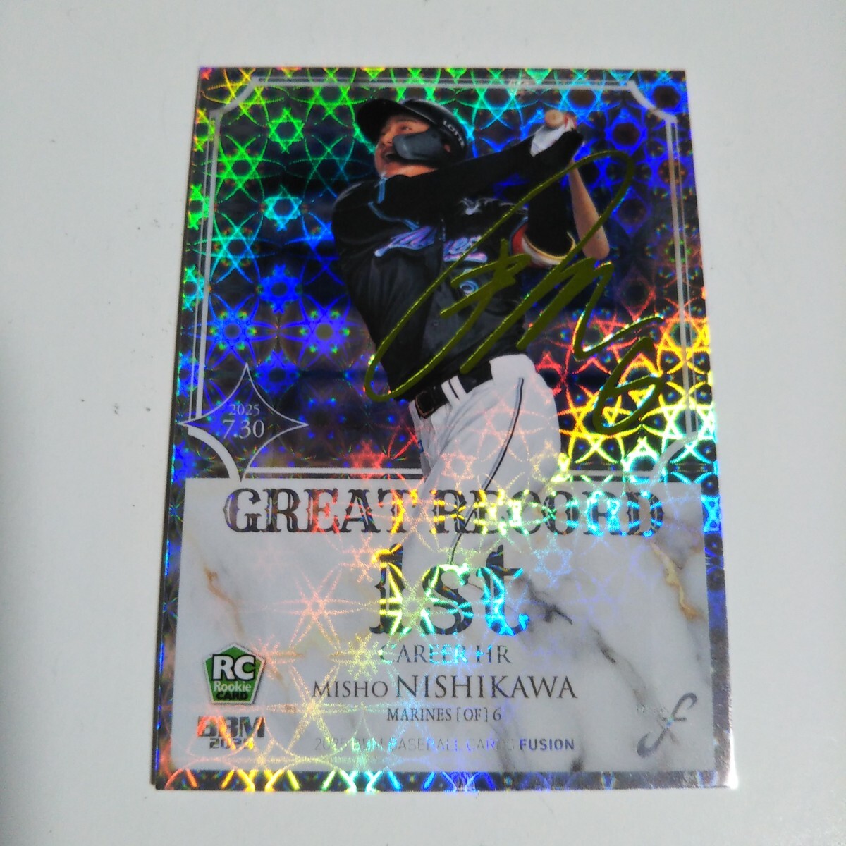 BBM2025 FUSION ロッテ 西川史礁 200枚限定 キウイグリーン箔サイン版 パラレル インサートカード GREAT RECORD ルーキー GR18
