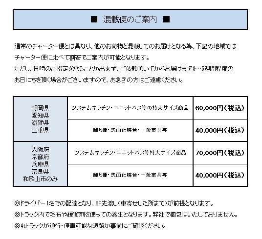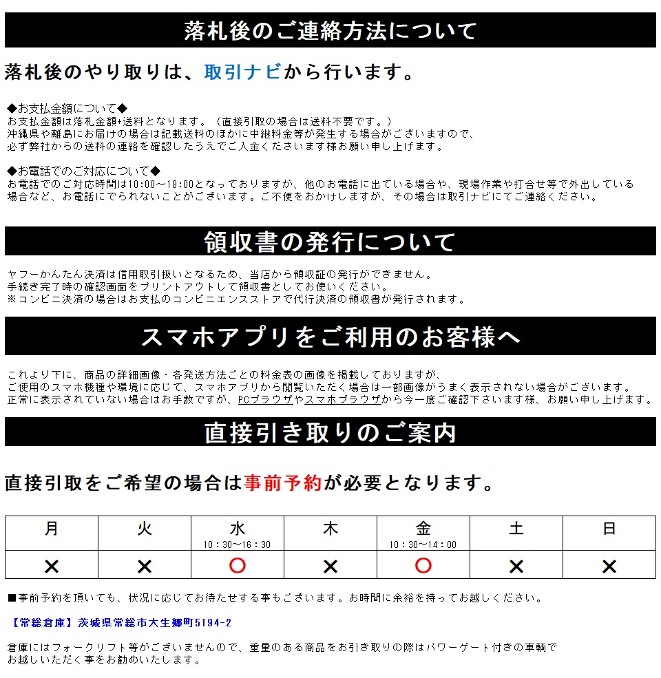 | ■発送方法 : | お客様による直接の引取か、当社の自社配送にて 都内近郊のみ 16500円~ で発送承ります。 配送ができない地域もございますので、あらかじめ御相談をお願いします。 原則として軒先渡しとなります。 1名でのお伺いとなりますので、搬入に2名以上必要な商品をお届けの場合はお客様にお手伝いをお願いする場合がございます。 その他の地域の方はチャーター便もしくは混載便をご利用ください。 | |