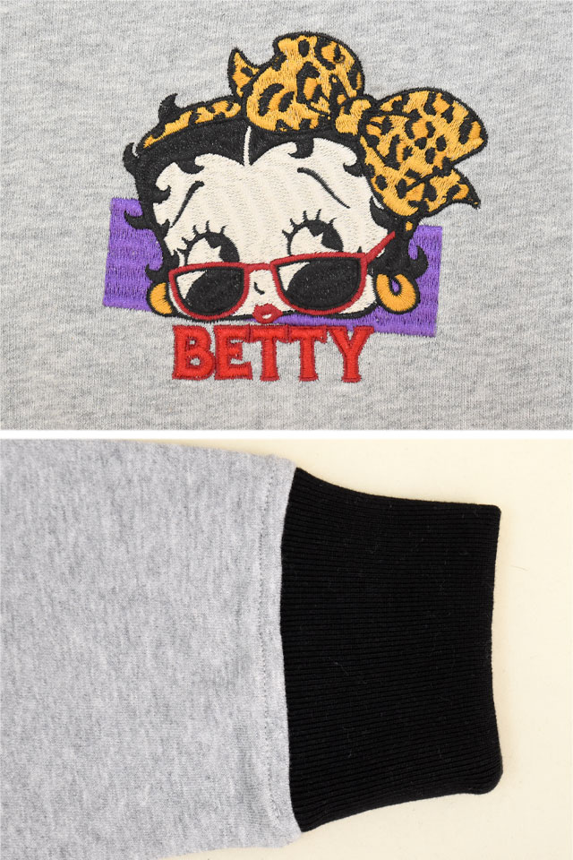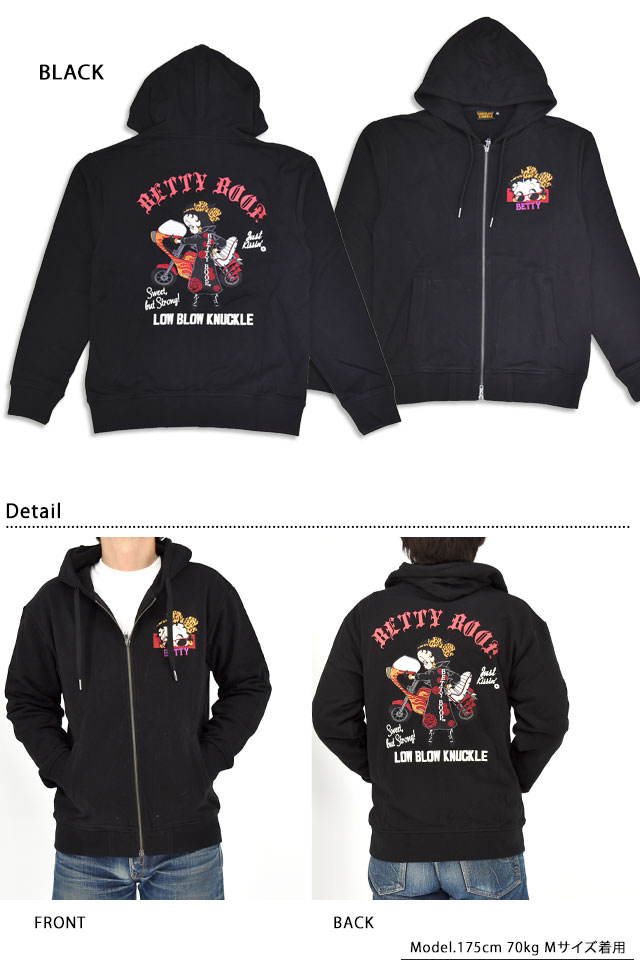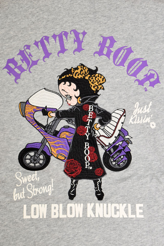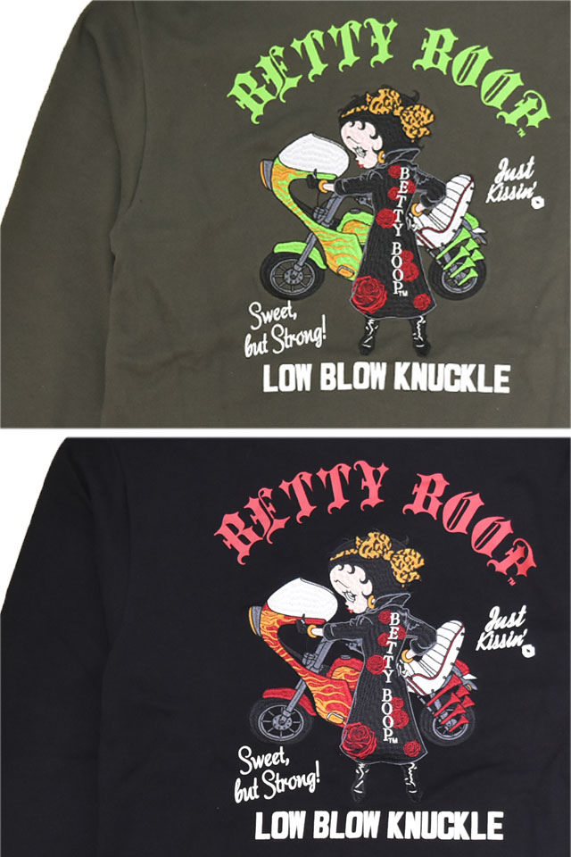 ロウブロウナックルから「LBK×BETTY 夜露死苦ヤンキーBETTYフルジップスウェットパーカー(595862)」のご紹介です。 大きな瞳とぽってりした赤い唇が印象的な女の子、ベティ・ブープ(Betty Boop)。 バックには特攻服を纏ったベティと愛車が刺繍で描かれています。 それぞれのボディーカラーに合わせて、用いる色味にも変化を持たせ、異なる表情に仕上げました。 左胸にはベティをワンポイントで刺繍しています。 ボディーには、裏毛タイプのスウェット生地を採用。 | ||||||||||||||||||||||||||