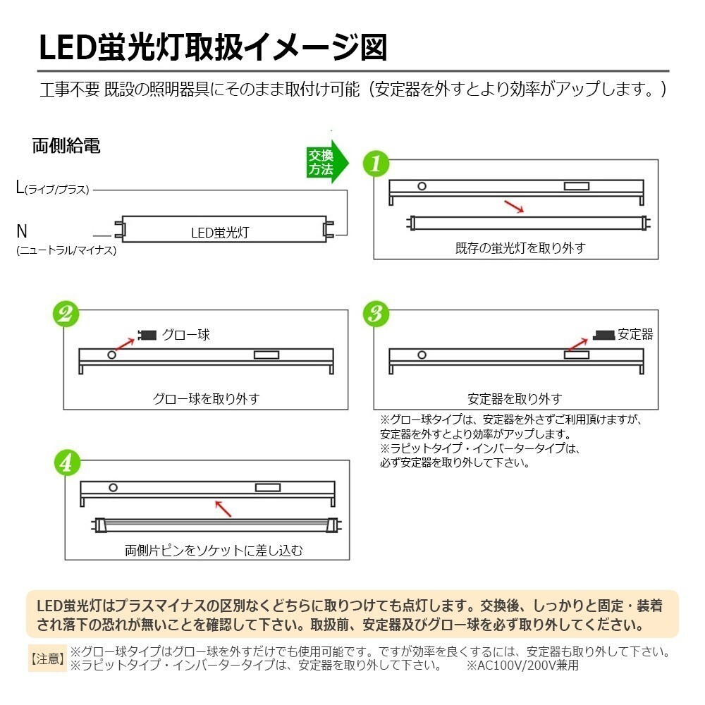 | 注意事項 | ※グロー球タイプはグロー球を外すだけでも使用可能です。 ※ラピットタイプ・インバータータイプは、安定器を取り外して下さい。 ※取付・取外しは必ず電源を切った状態で行なってください。 ※点灯中・点灯直後は直接手でふれないでください。 ※自動点灯スイッチなどの器具には対応していない場合があります。 ※お使いの照明器具の仕様がわからない場合は、専門の電気知識がある業者や人にご相談ください。 | ||