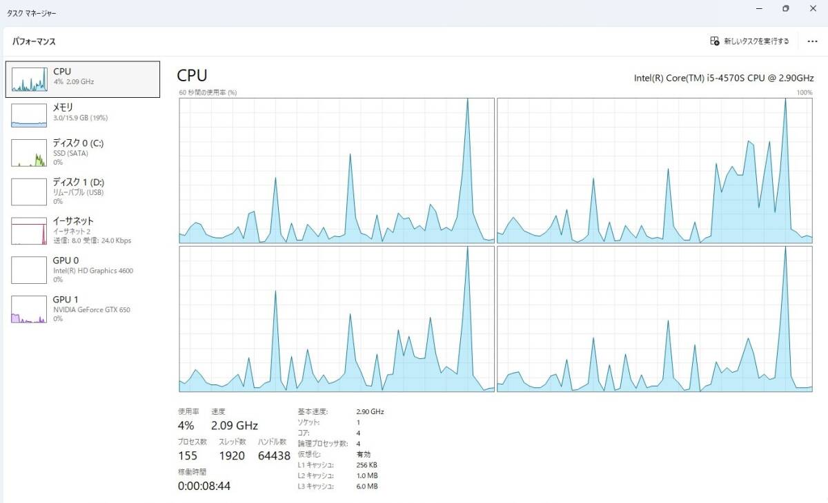 タスクマネージャー等の画面を載せています。(写真8~9)