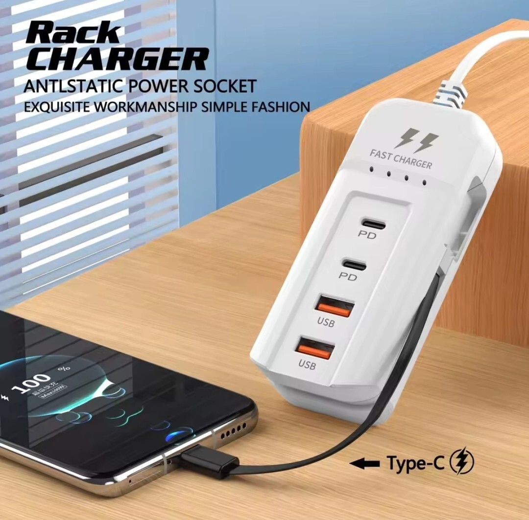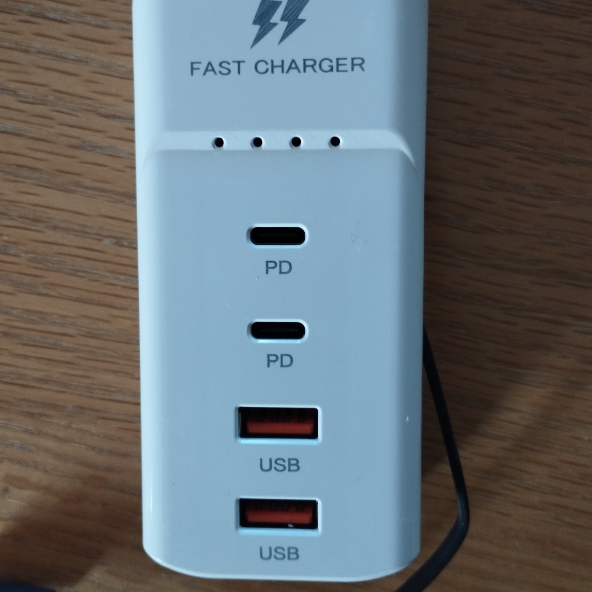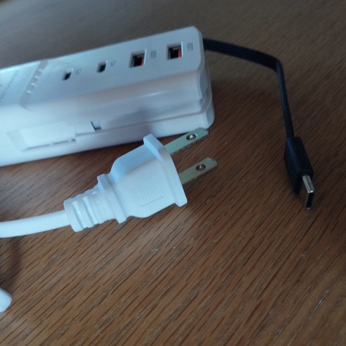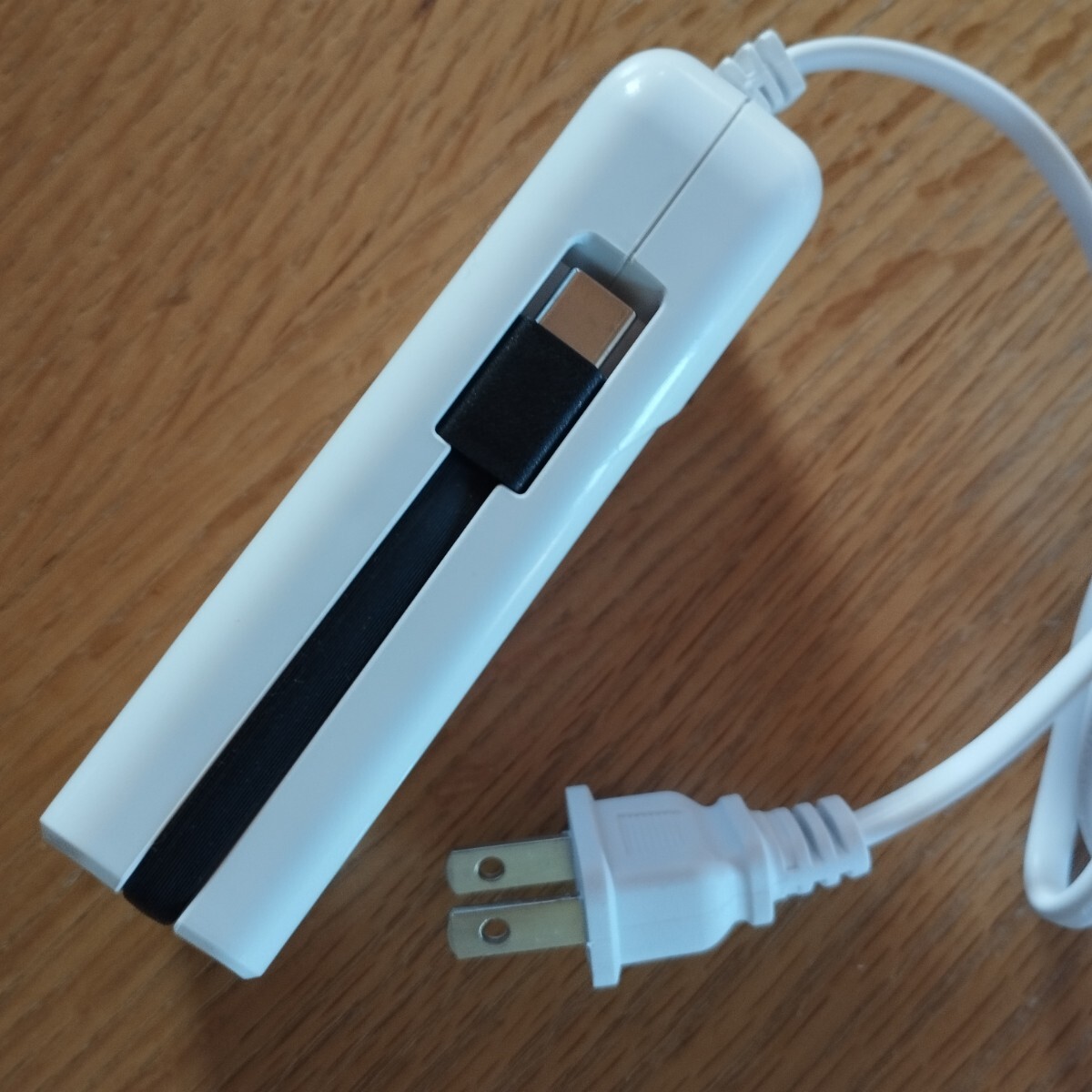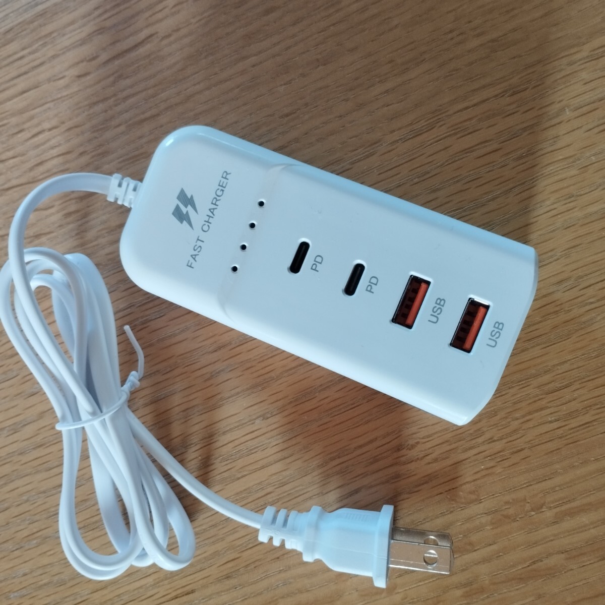 USB-AとUSB-Cポートがそれぞれ2つ、それにUSB-Cのプラグ付コードが搭載されていて、コードはどこだ!と探さなくてもすぐに充電を開始出来るスグレモノです。電源コード長1m、各ポート最大5V5.1Aの出力(合計66W)です。