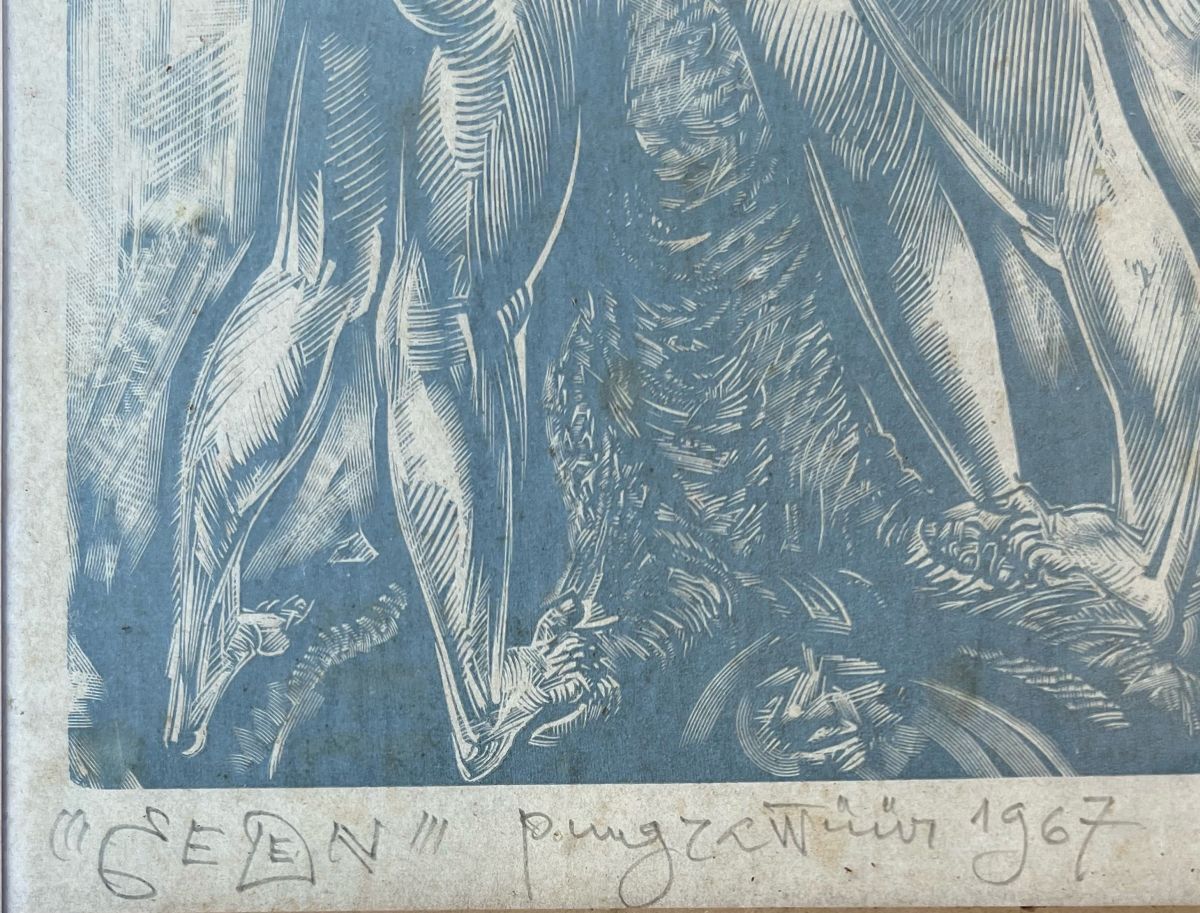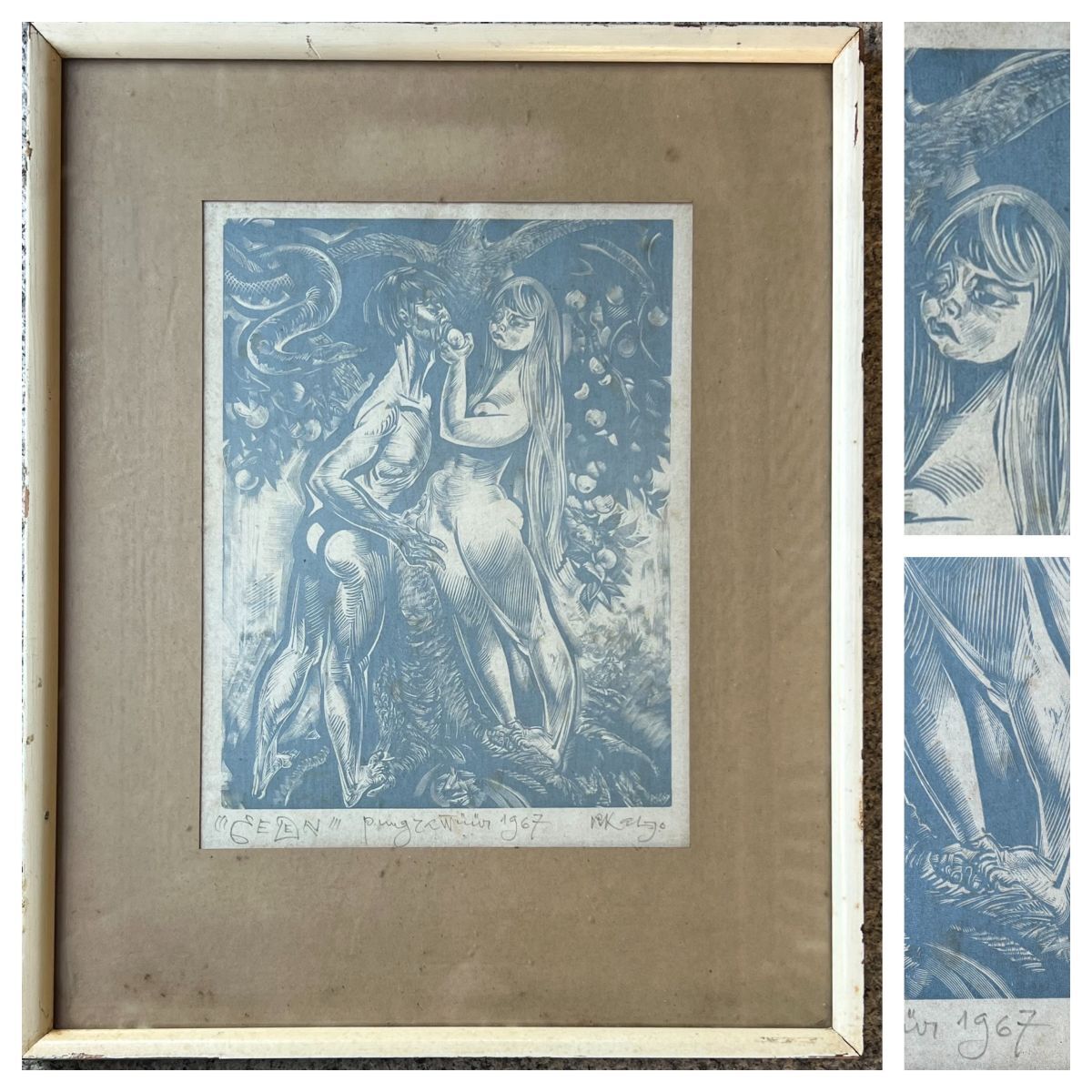 【作品概要】 真作 Richard Kaljo(リチャード・カルヨ/19141978)による木口木版(wood engraving)「Eeden(エデン)」1967年。 アダムとイヴ、禁断の果実、蛇を主題にした宗教的モチーフの力強い版画です。 サイン・年記「1967」、タイトル表記あり。額装済み。 ・技法:木口木版(wood engraving) ・版面(プレート)サイズ:およそ 23.7 × 18.2 cm ・額サイズ:およそ 34 × 41 cm ・署名:右下に鉛筆サイン、年記「1967」/下辺中央にタイトル “EEDEN” ・エディション:表記不明(視認できず) 【略歴】 Richard Kaljo(19141978) エストニアの版画家・イラストレーター。木口木版を中心に、書籍挿絵や宗教・神話・文学題材の作品を多数制作。 東欧モダン版画を代表する作家の一人としてコレクターに人気があり、国内外の美術館・図書館に作品収蔵例あり。 【作品説明】 細密な彫線で人体の量感と樹木の質感を描き分け、月明かりのような陰影で緊張感ある場面を構成。 アダムとイヴ、蛇、果実の樹という古典主題を、1960年代の東欧グラフィックらしい モダンな造形で再解釈した一枚です。飾りやすい中判サイズ。 【状態】 紙:周辺に経年のヤケ・薄シミ・薄い擦れあり。版面の刷りは良好です。 写真のものがすべてとなります。 詳しい状態については写真を確認してください。 写真追加希望の方は質問より気軽におしゃってください。 |
