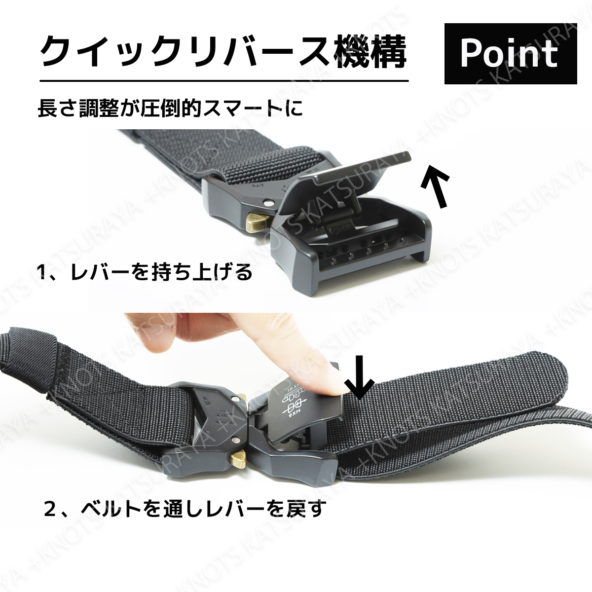 片手でワンタッチで着脱可能、手袋やグローブを着けていても扱いやすい。長さ無段階調整、ピンや穴はなく好きな場所で固定することができます。クイックリバース機構により長さ調整がとても簡単になりました。お仕事やアウトドアシーンに、普段使いまで幅広く活躍します。