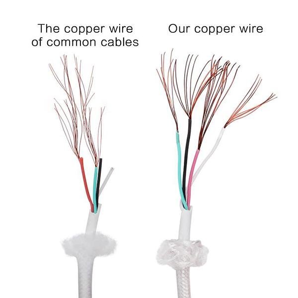 【超タフで断線に強い】ケーブルの中に厚くて優質の銅製ワイヤを使用しています。コネクタ部分にアルミニウム合金、接続部分は金メッキを施し、ケーブルマスコット部分を増長して折れ曲がりに強く、接合部分は硬質プラスチックを使用し、根本からのケーブル断線を強く防ぎます。