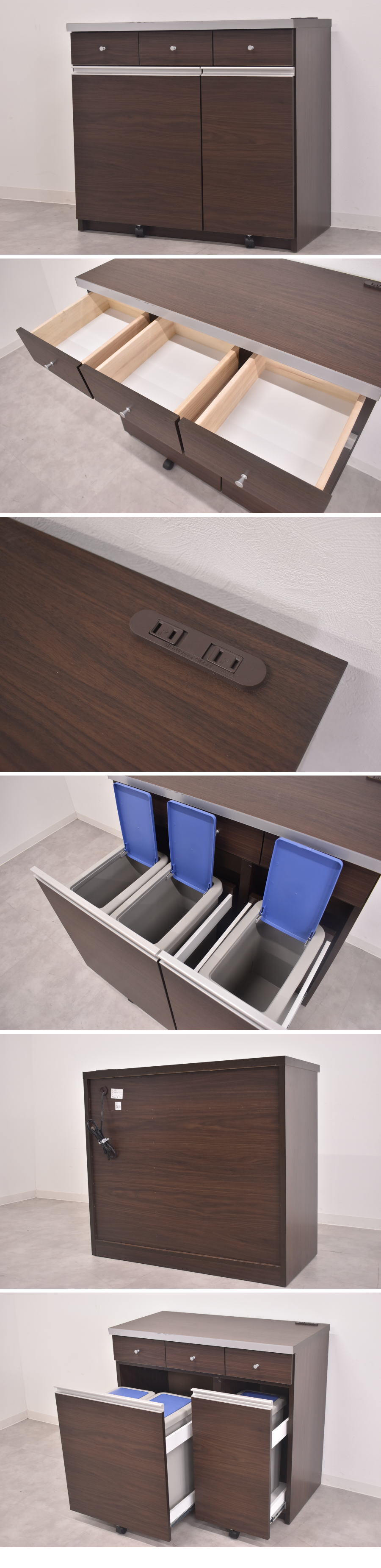 キッチン 90cm幅ダークブラウン ダスト カウンター ごみ箱です。 天板にコンセントが付き何かと便利です。 引き出し3杯は小分けに収納できます。 下段はダストボックスになり3ヶ所でごみの分別ができます。 背面も化粧が施され仕切りとしてもご使用頂けます。 ※新品未使用品ですがアウトレット展示品の為、若干小キズ汚れ等あります、ご使用上には問題はございません。 |