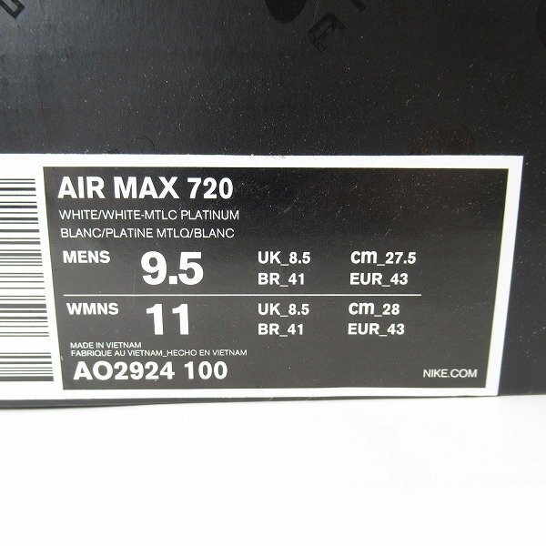 | 【未使用】 NIKE/ナイキ AIR MAX 720/エアマックス 720 シューズ/スニーカー AO2924-100/27.5 /080 | |||||||||||||||||||||||||