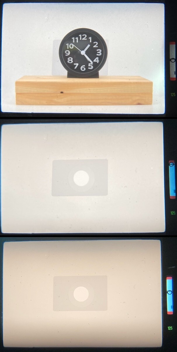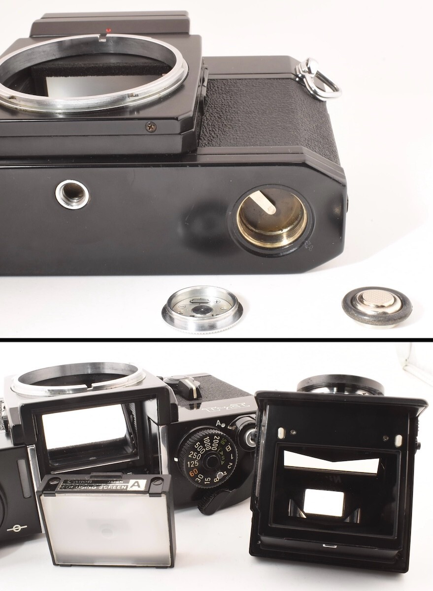 光学系:アイレベル、フォーカッシングスクリーン内は清掃済みですが、プリズムに取りきれない点ゴミがあります。(腐食ではありません)又、スクリーンフレネル部に経年劣化による点汚れが見えます。