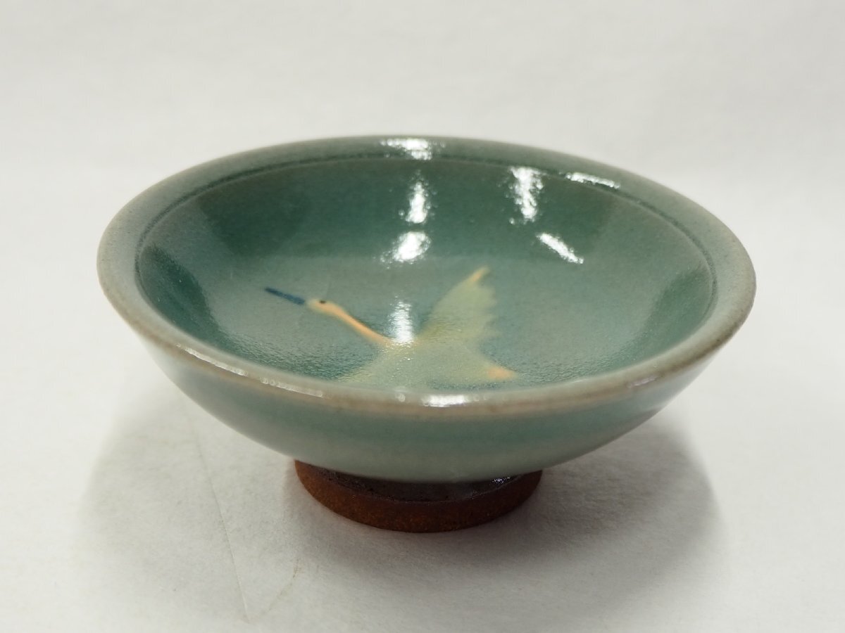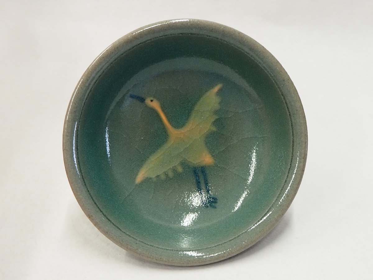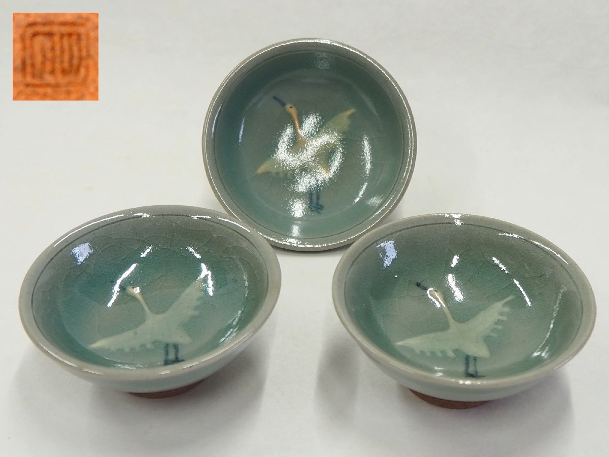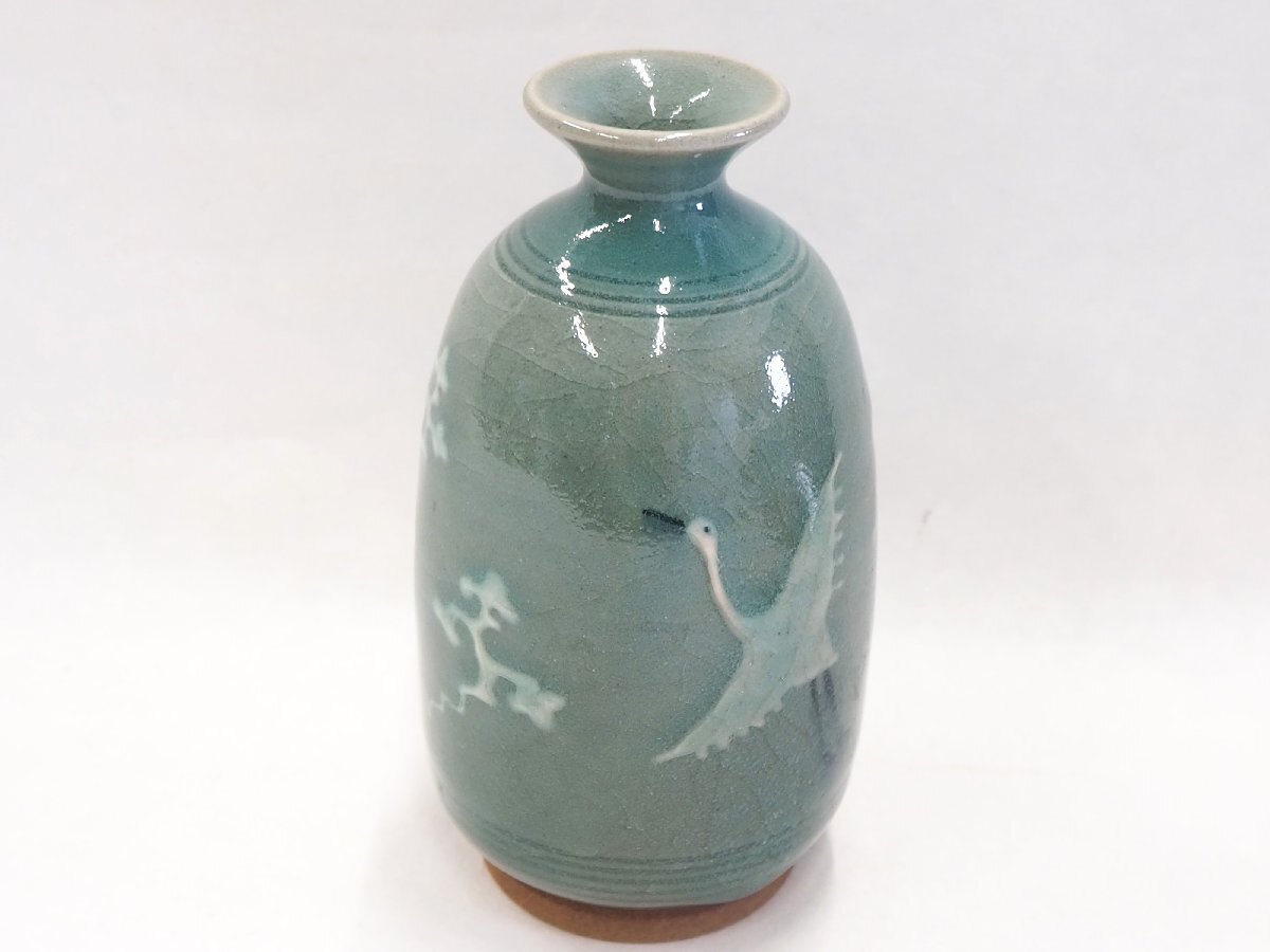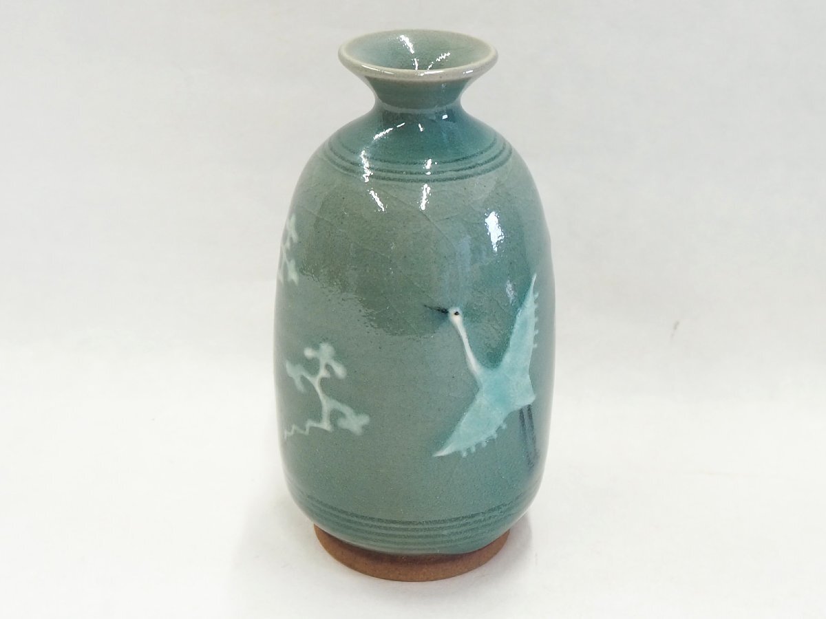 ★☆【 青磁 鶴図 酒器セット(徳利1本+酒盃3客)平盃 底に在銘 】酒器 酒盃 日本酒 お猪口 ☆★
