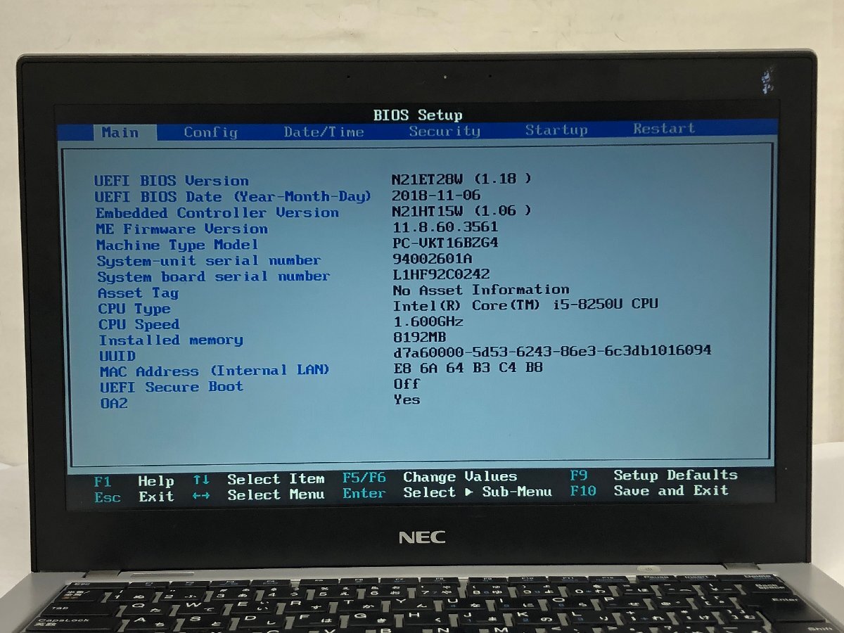 ジャンク/ NEC PC-VKT16BZG4 Intel Core i5-8250U メモリ8.19GB ストレージ無し 【K22900】