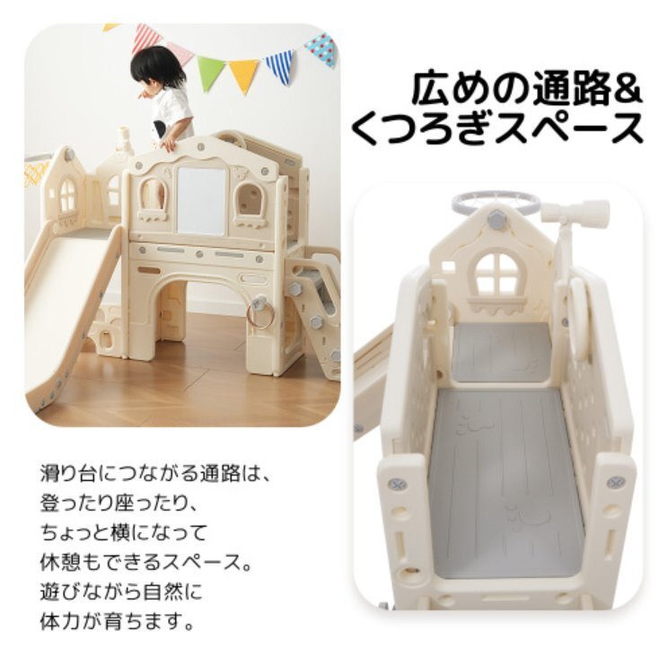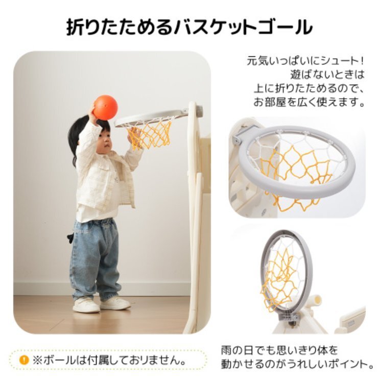 • ◎02 【やさしいカーブの滑り台】なめらかなカーブがやさしく体を受け止め、安心して滑れる設計。お部屋の中でも「もう一回!」の声があふれます。使わないときは折りたたんで、省スペースに収納可能。