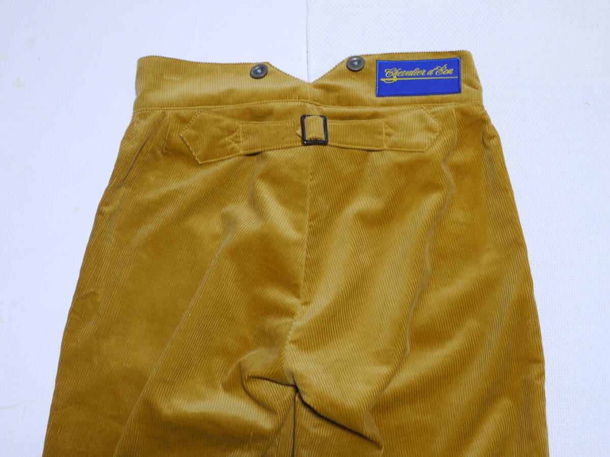 この頃のスラックスパンタロンの特徴として、後ろが山形にせり上がったハイバックでボタンサスペンダー吊り