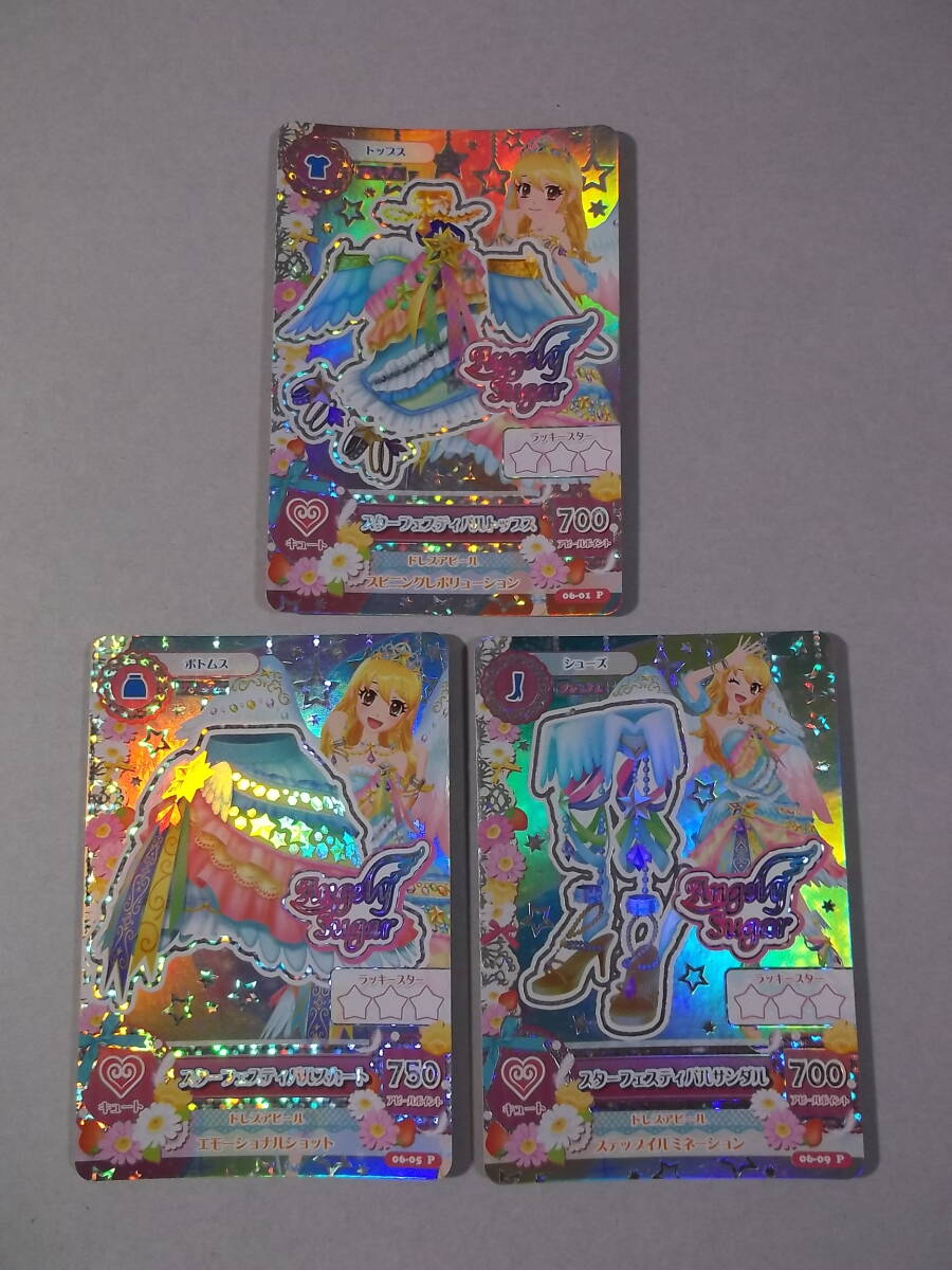 | <最初に> 当方、持病により急遽入院になる場合があります。 そのため落札いただいても取引ができなくなることがありますことをご了承下さい。 詐欺をする気は全くありませんが、不安がありましたら入札をお控え下さい。 バンダイのデータカードダス、アイカツの第6弾のカード、 スターフェスティバルコーデのセミコンプセットをお譲りいたします。 内容はアクセサリを除く3種になります。 状態は大きな折れや汚れはありませんが、細かい傷や剥げなどが 多数見られますので、あくまで中古品として判断していただき、 完品や美品をお求めの方はご遠慮下さい。 それでも問題無いという方のみでお願いいたします。 現在お求め中の方、この機会にいかがでしょうか? | ||