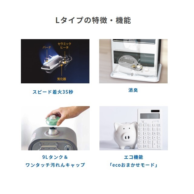 ・持ち運びに便利な「タンクWとって」、給油時に便利な「ワンタッチ汚れんキャップ」、給油モニター(給油サイン)搭載