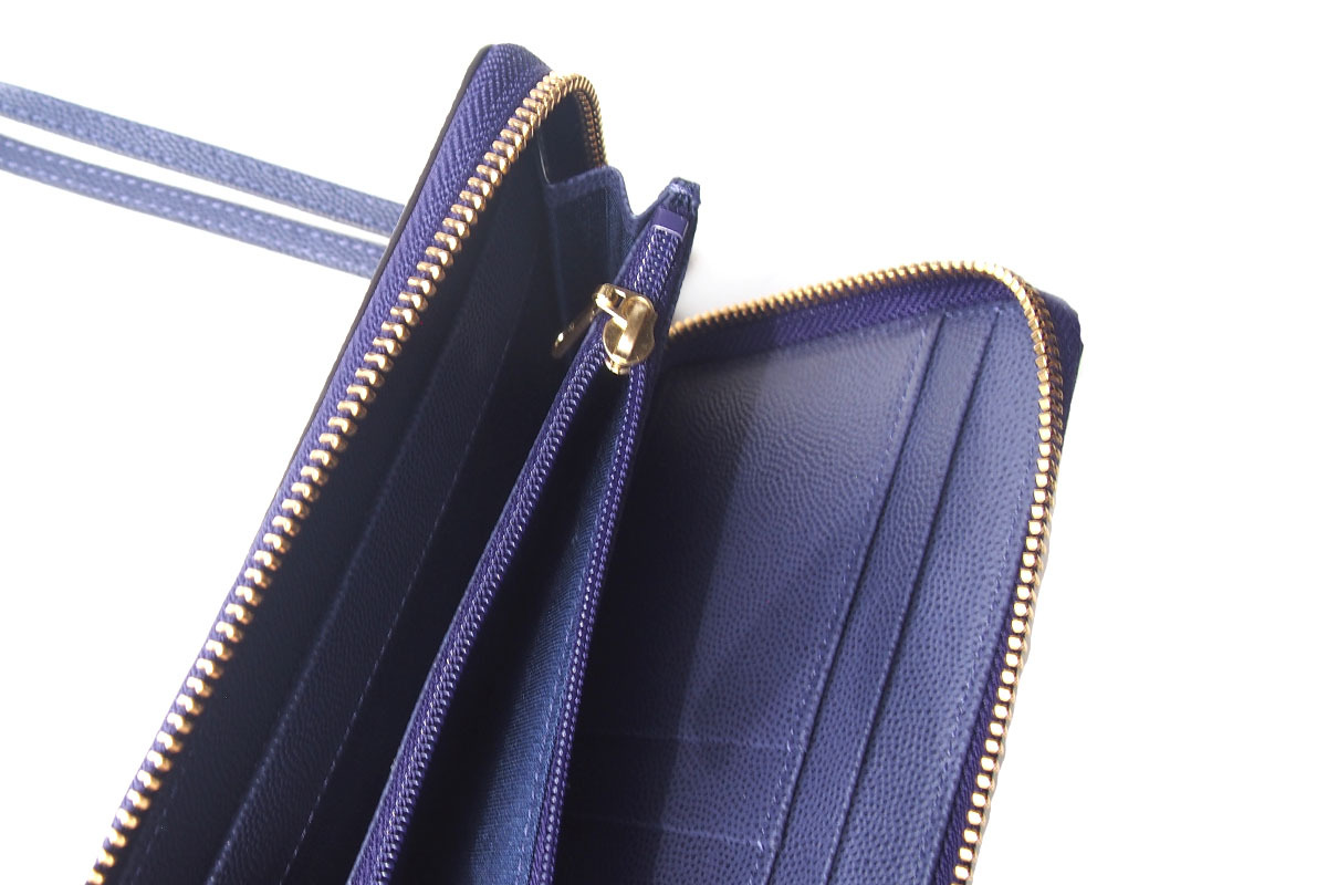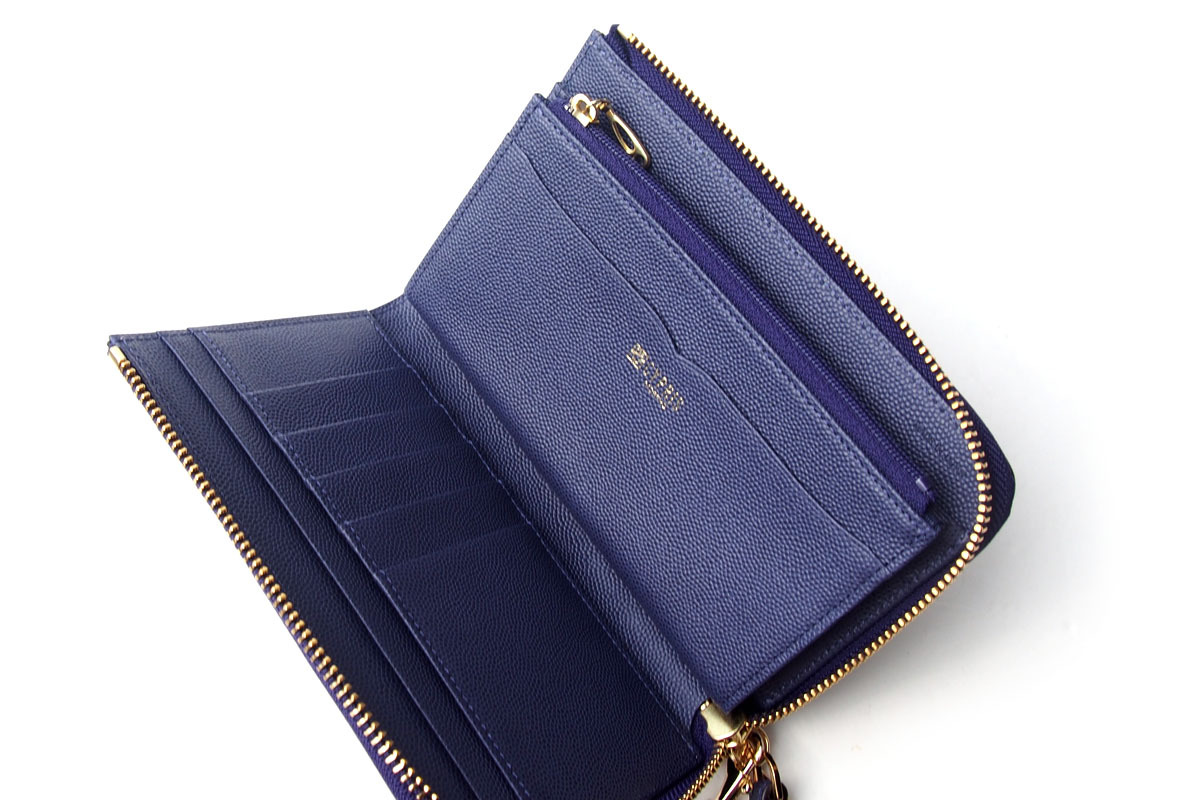 内装にはカードポケット5枚分とファスナー式小銭入れを備え、二つ折りにした紙幣も収納可能。