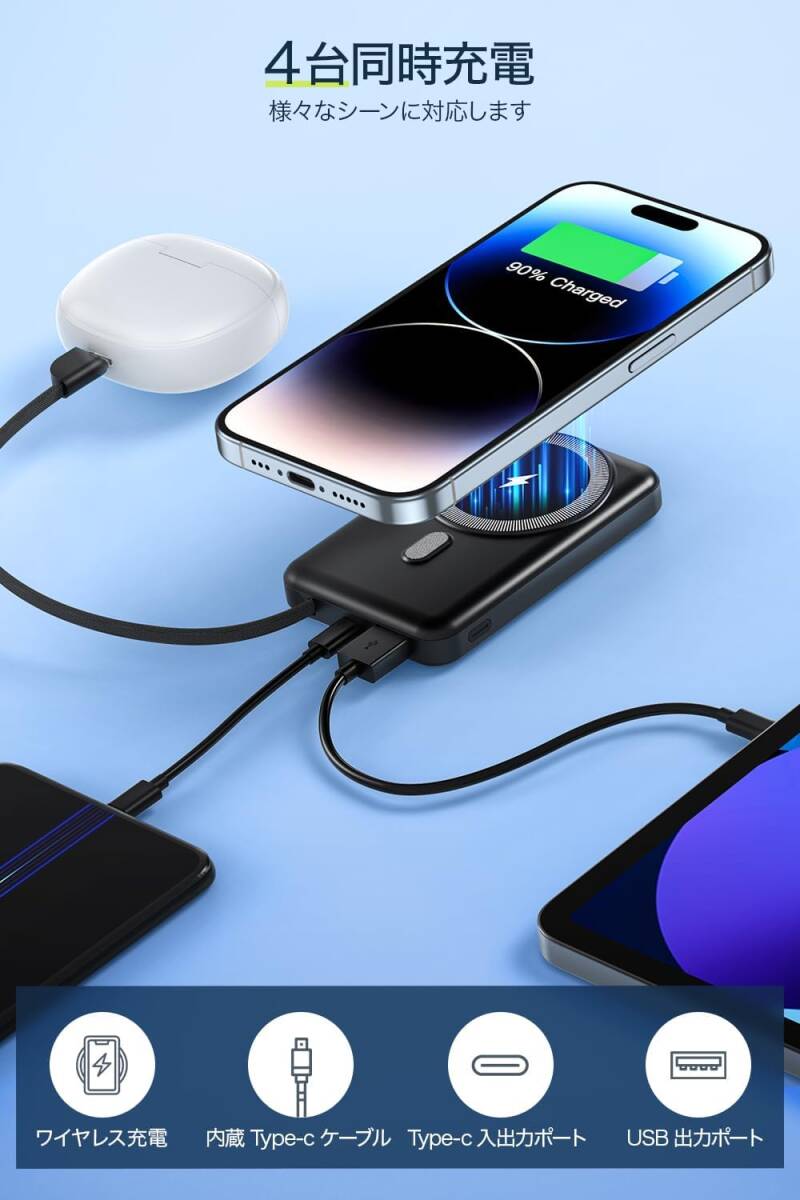 • 【タイプcケーブル内蔵バッテリー・ 4台同時充電可能 】 Type-C出力内蔵ケーブル(22.5W MAX出力)、入出力兼用ポート(PD20W MAX出力)、USB-Aポート(22.5W MAX出力)、ワイヤレス充電(15W MAX出力)、合わせて最大4台を同時に充電可能です。複数台のスマホを同時に充電可能、友達や、家族へシェアができてとても便利です。※大きな電力を要するデバイスを急速充電する際は、単独で充電することが推奨されます。外出や出張の際、たくさんの充電ケーブルを持ち歩きたくない場合は、このモバイルバッテリーがとても良い選択肢になります。