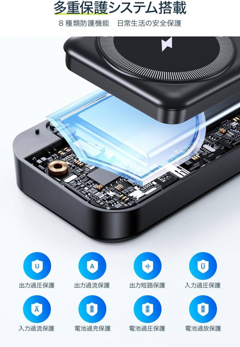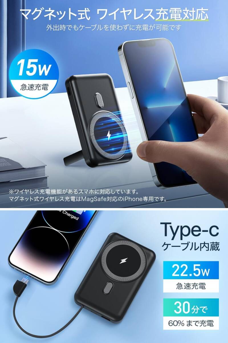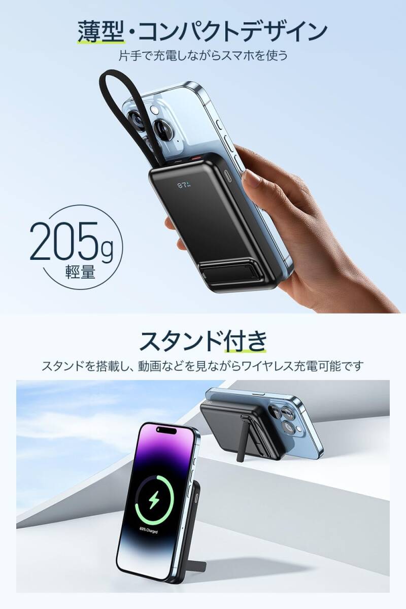 • 【マッグネット式ワイヤレス充電】 大人気のワイヤレスモバイルバッテリーが新登場!ワイヤレス充電と内蔵ケーブルが一体化され、日常的な携帯電話の充電がさらに便利になりました。また、スタンドを搭載し、動画などを見ながらワイヤレス充電可能です。106mm*67mm*19mm、205gのポータブルサイズで通勤通学の外出時や出張の際にはもちろん、停電の際や災害時に活用できる防災用途のバックアップ電源として幅広いシーンでご利用いただけます。